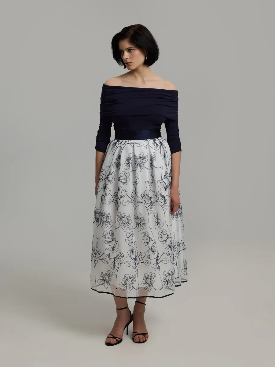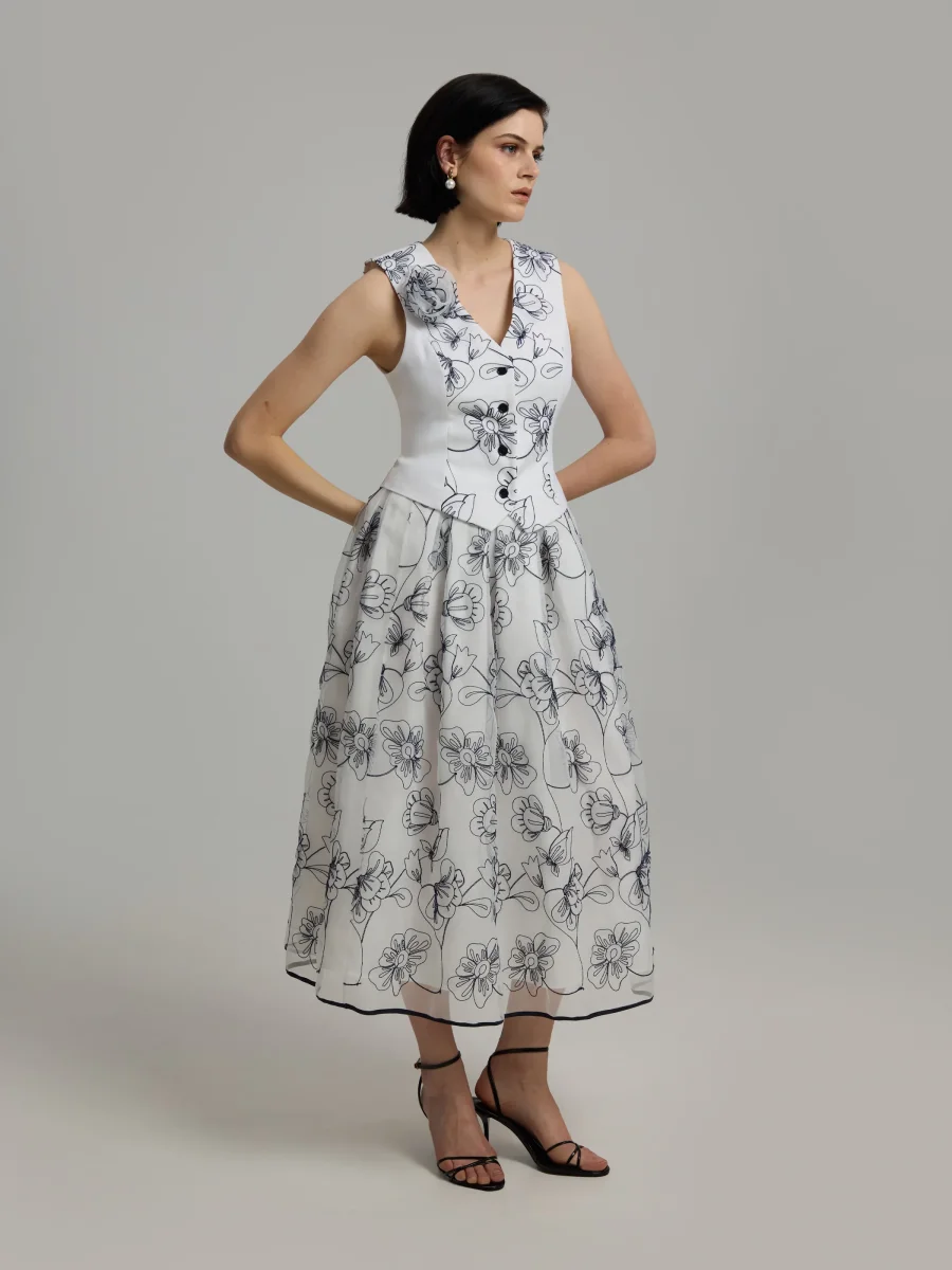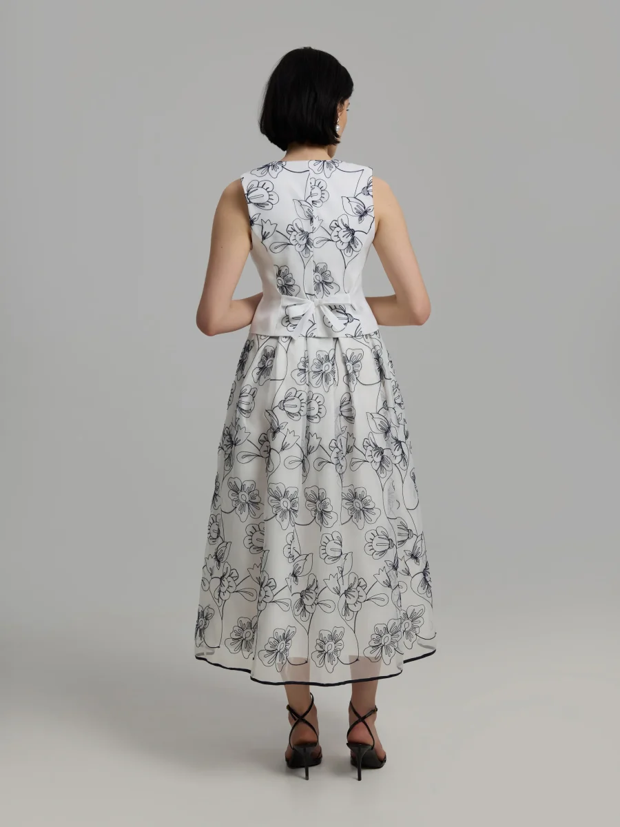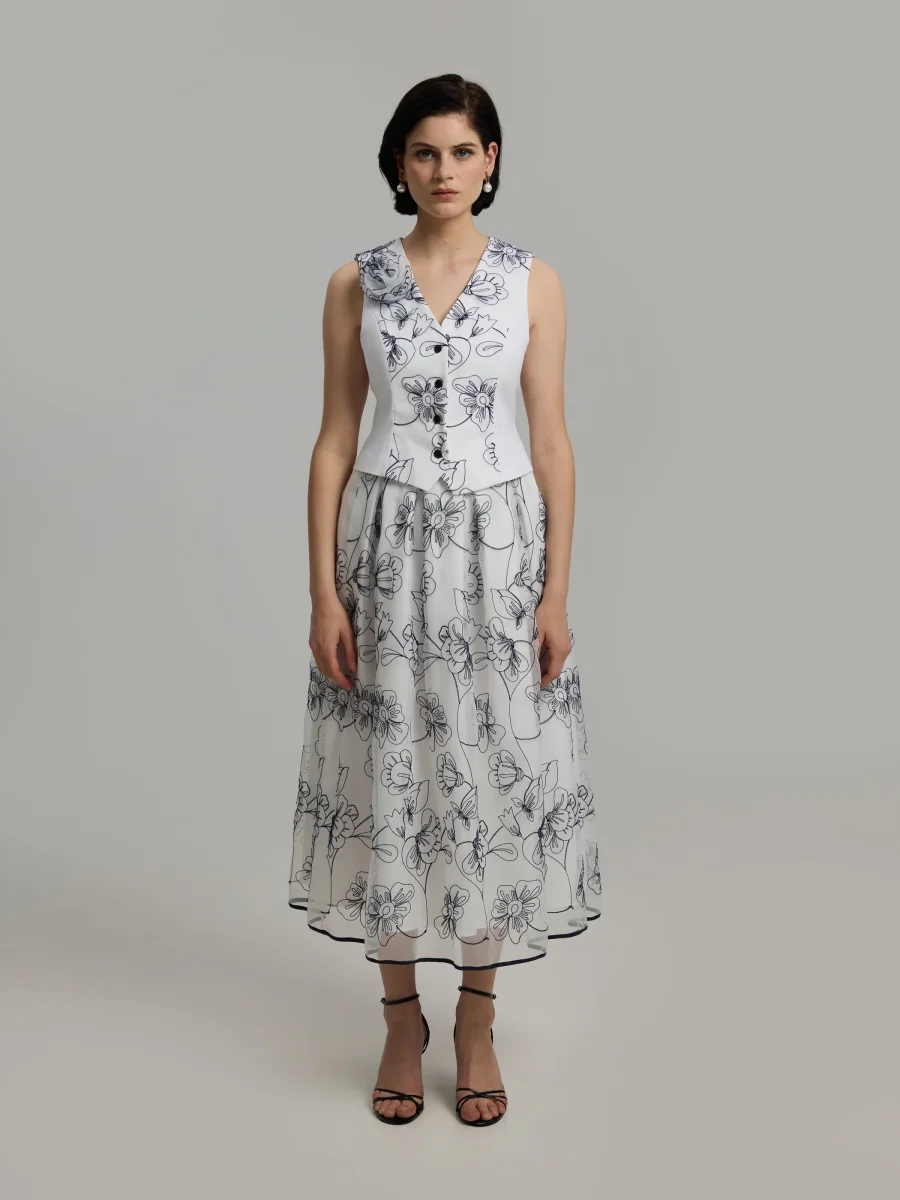 Ankellång kjol med djärva veck och voluminös fåll. Sidodragkedja och foder. Tillverkad i högkvalitativ italiensk organza. Svart foder i fållen. Styla med matchande Maiju-väst.