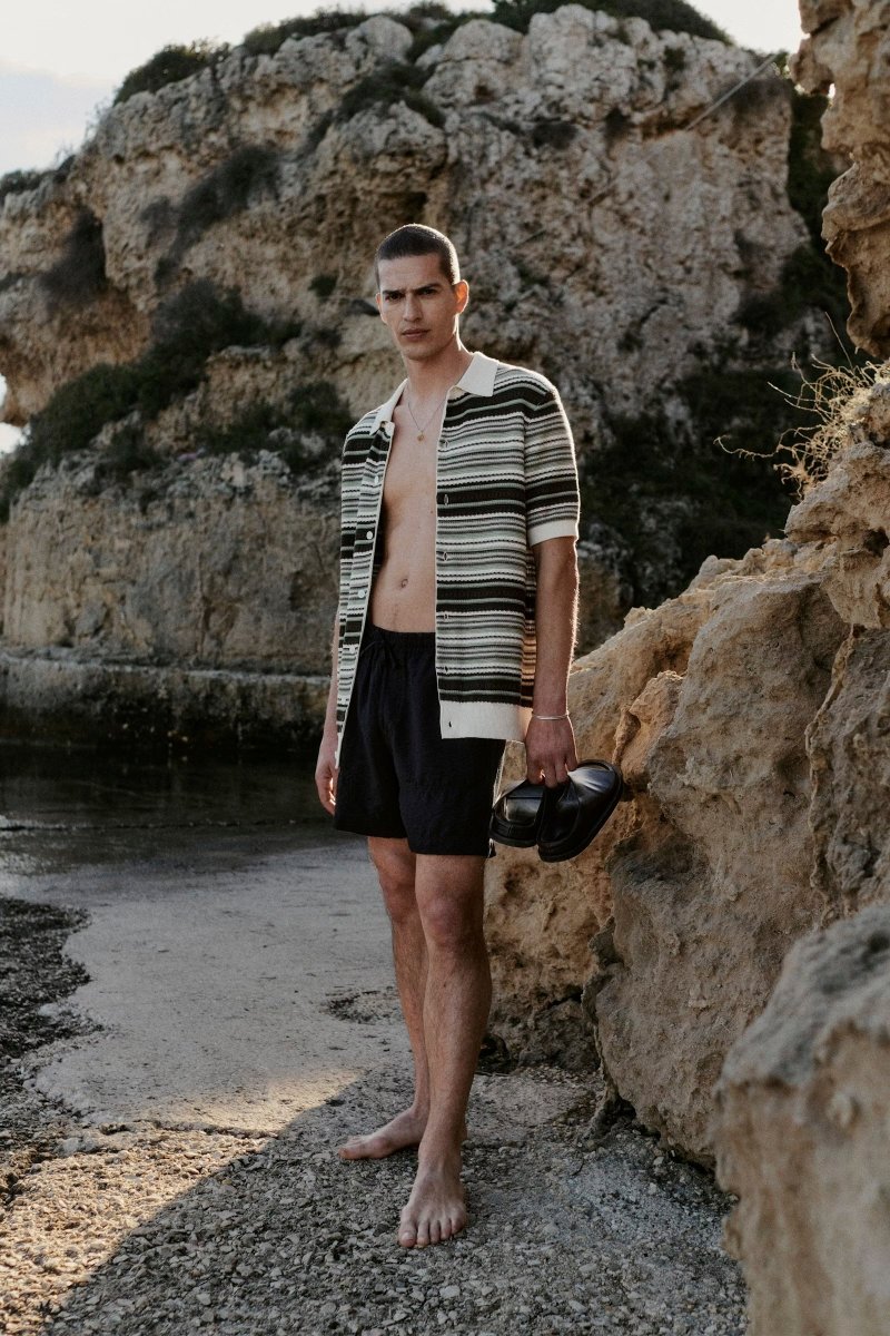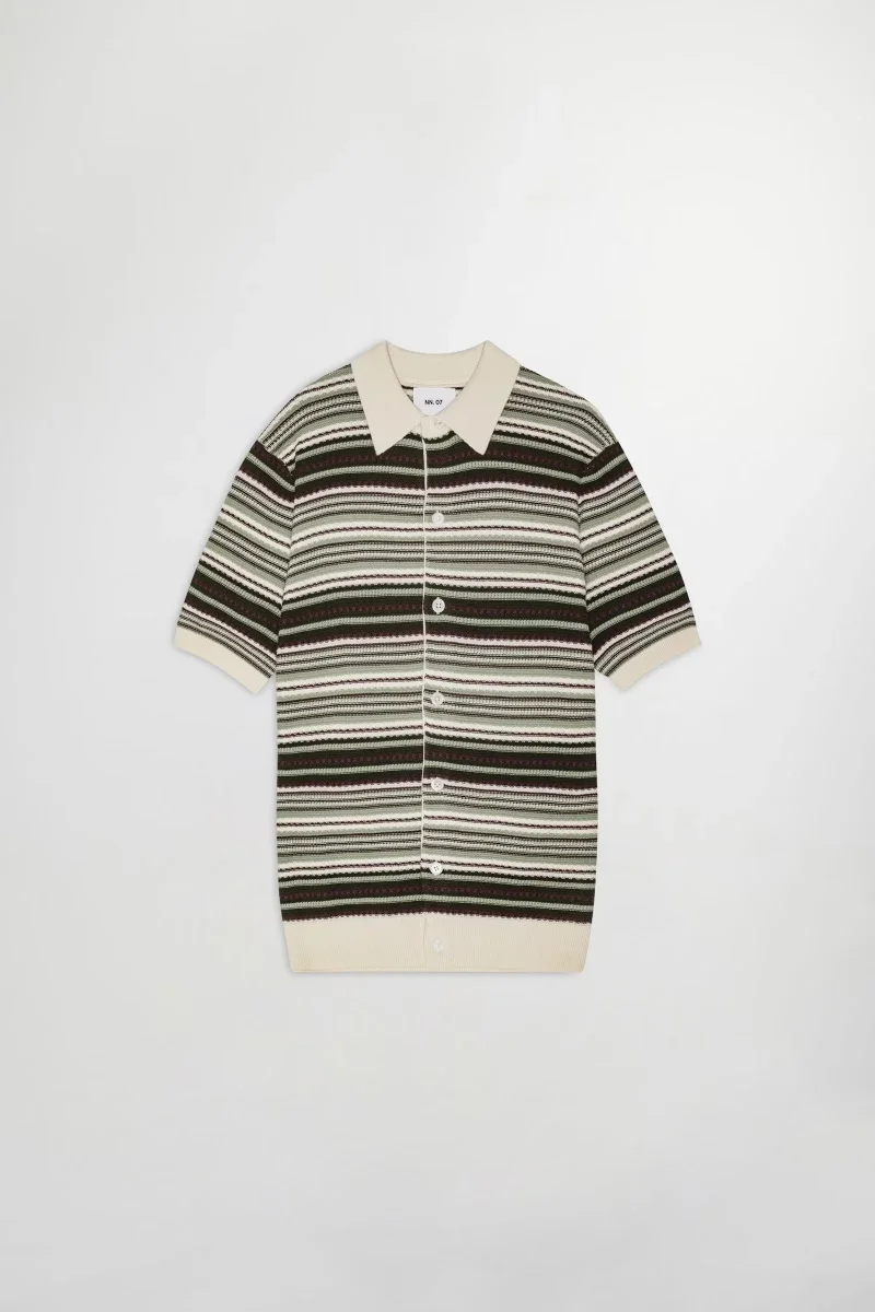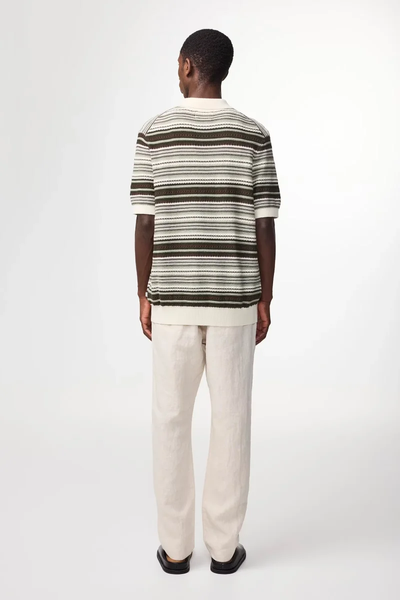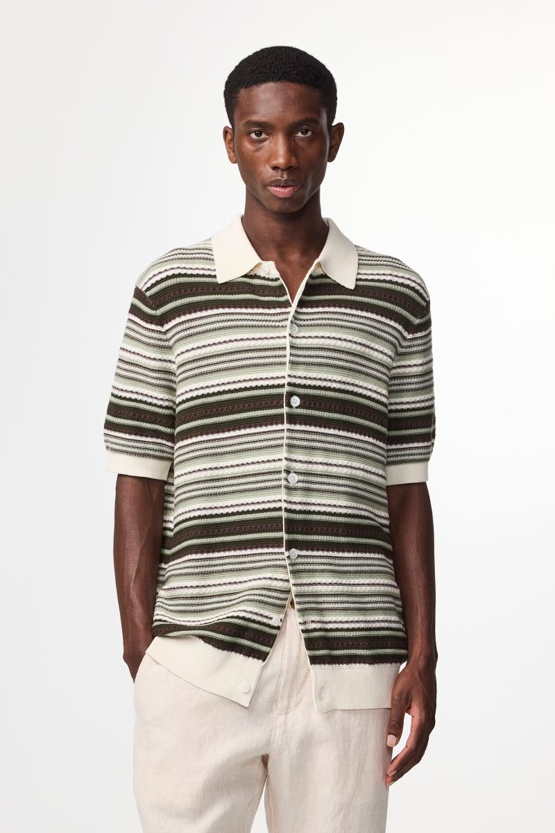 En polokofta med öppen krage tillverkad i ett randigt texturerat ekologiskt bomullsgarn med ribbstickade kanter, avslutad med pärlemorknappar.