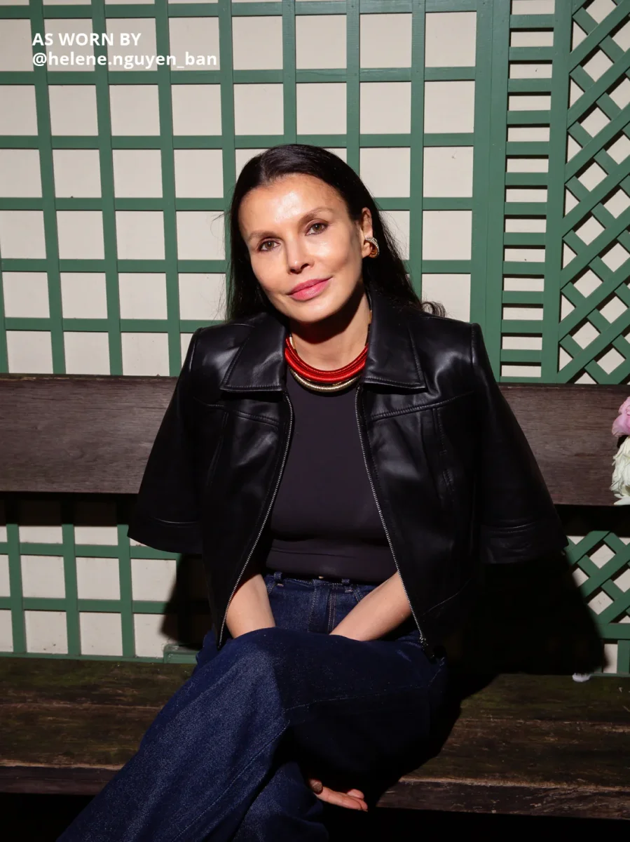 Midjelång läderjacka med dragkedja, armbågslånga ärmar och krage. Jackan är helfodrad.