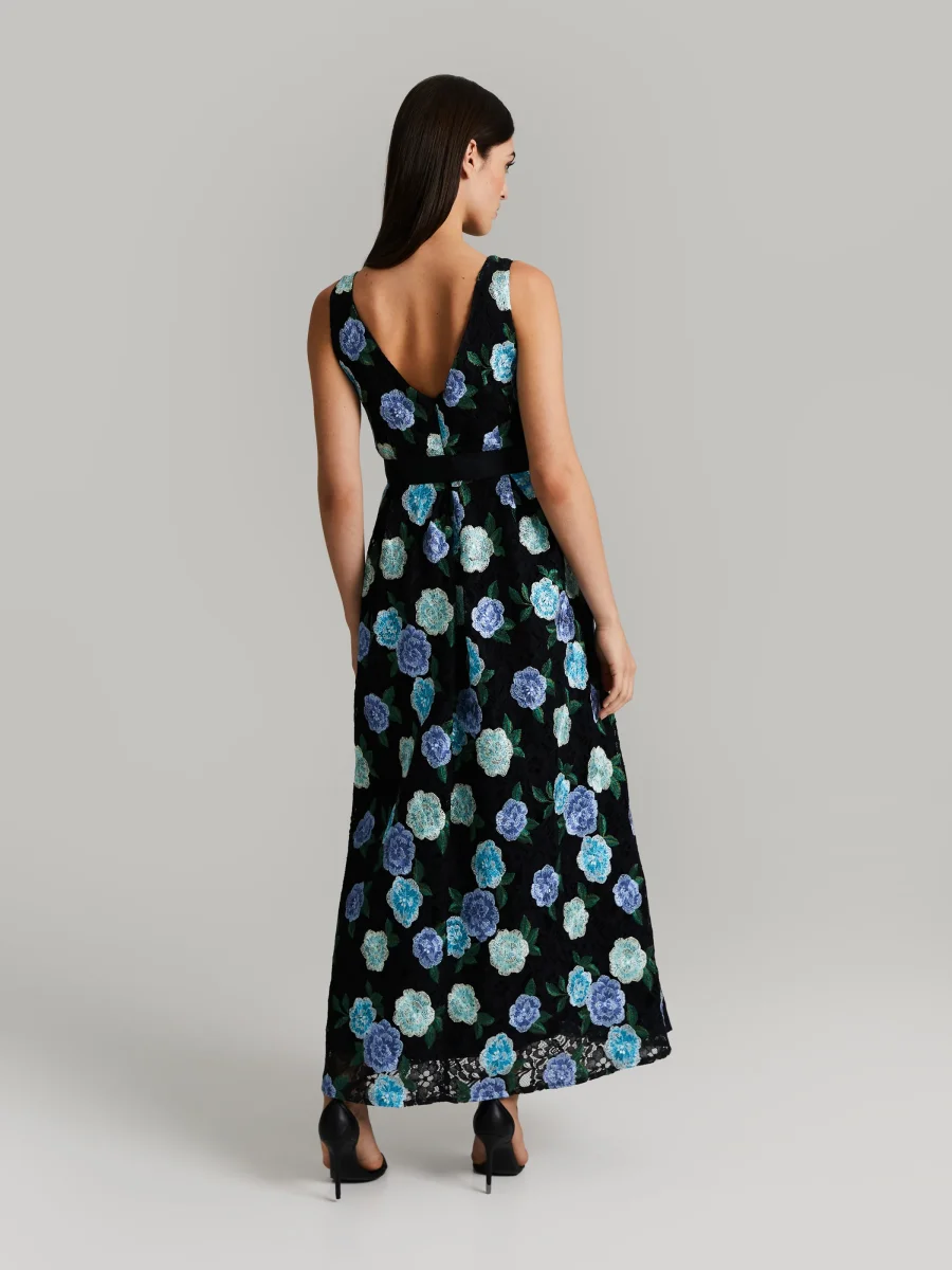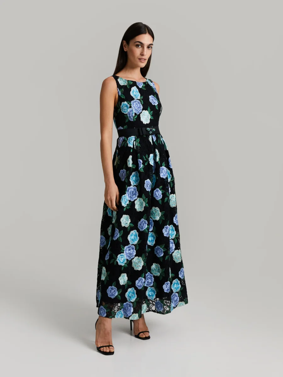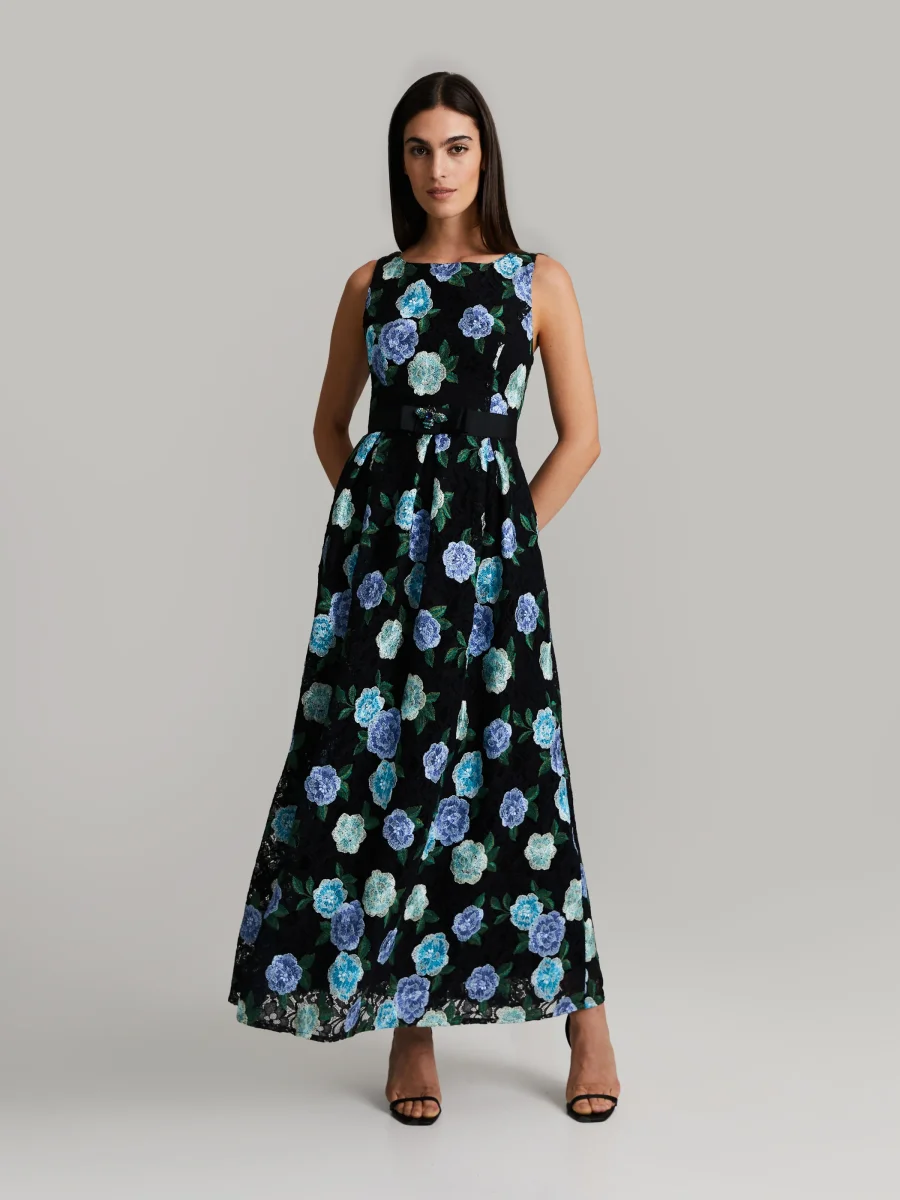 A-linje ärmlös klänning med en figursydd topp och veckad botten. Tillverkad av icke-stretch spets med slående blommiga broderier. Klänningen stängs baktill med dragkedja och är helfodrad.