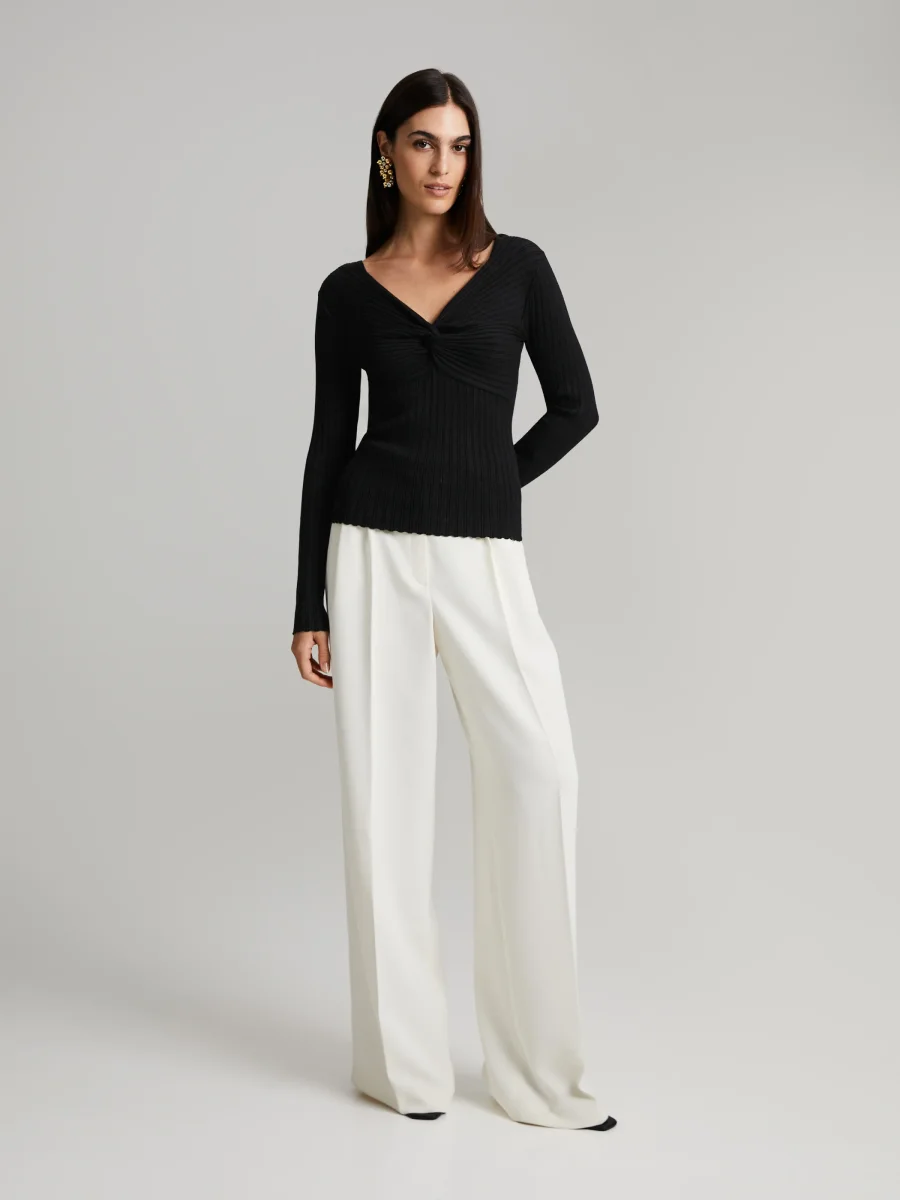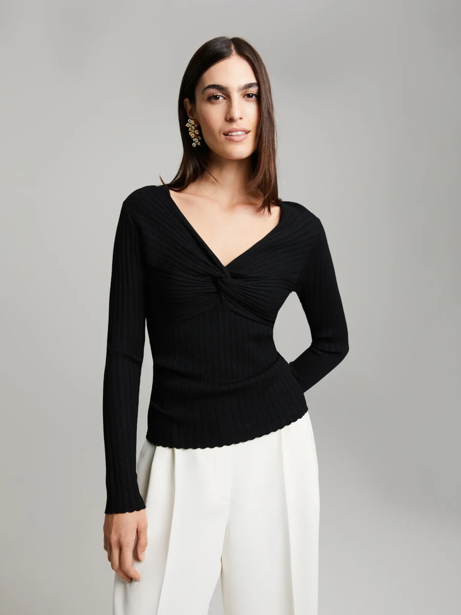 Stretchig ribbad blus, kroppsnära passform och knut under bysten.