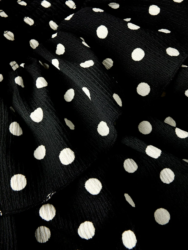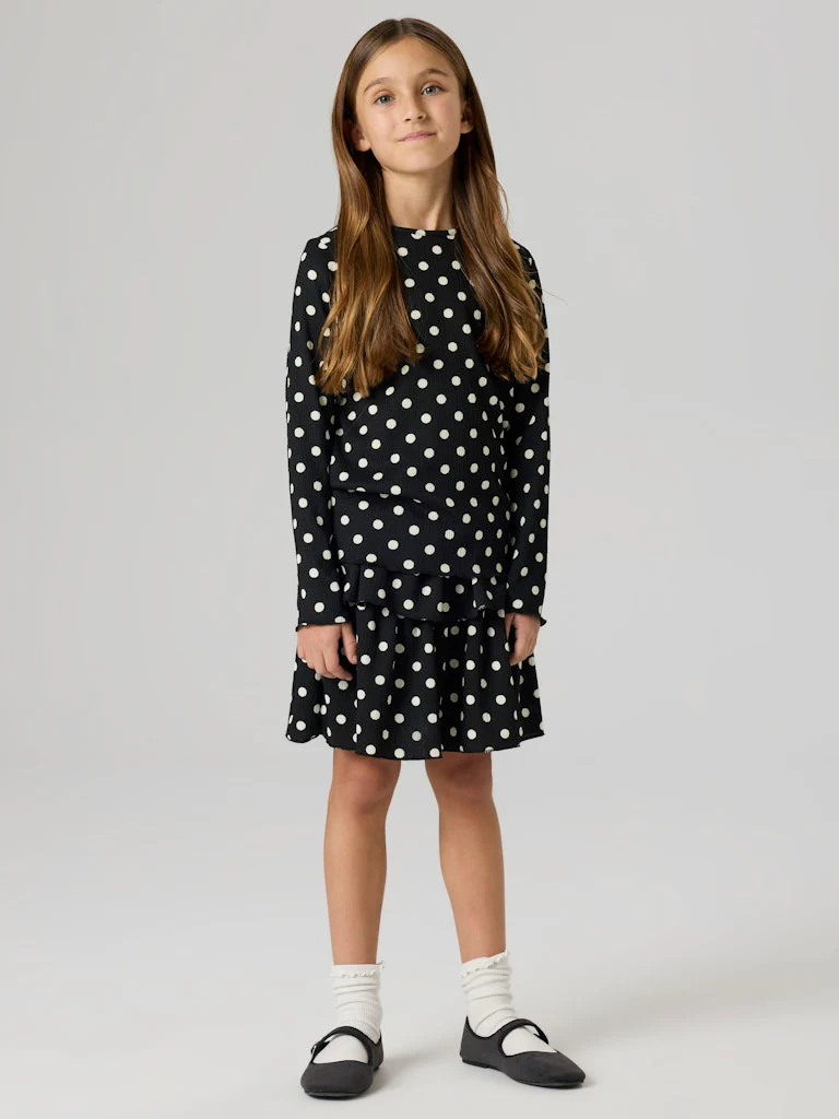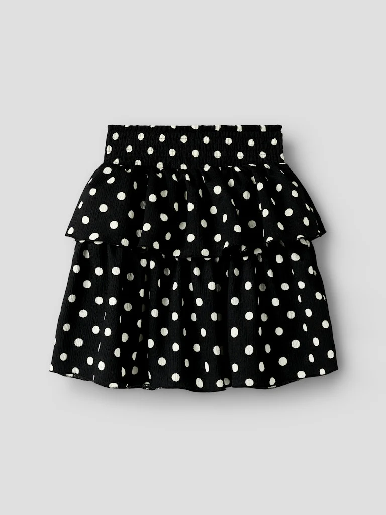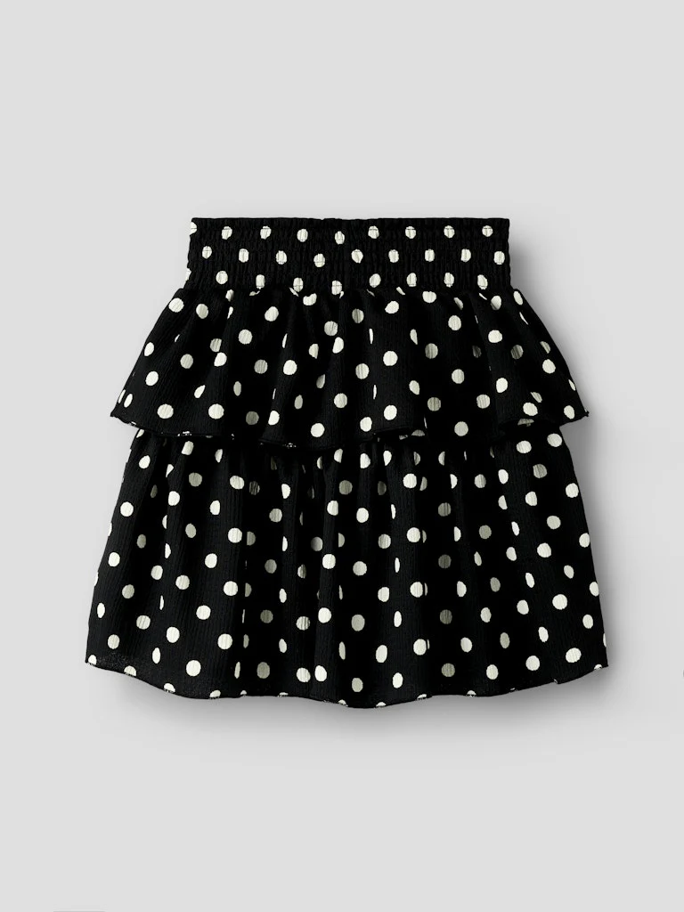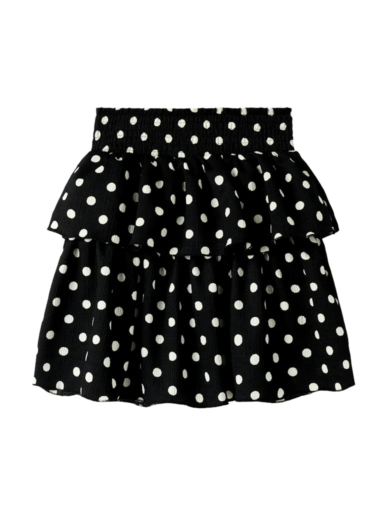 En cool och samtidigt söt kjol med klassiskt prickmönster som passar lika bra till vardag som till fest. Den luftiga modellen faller fint och ger ett härligt sväng i stegen, samtidigt som den mjuka resåren i midjan gör kjolen bekväm att bära hela dagen.