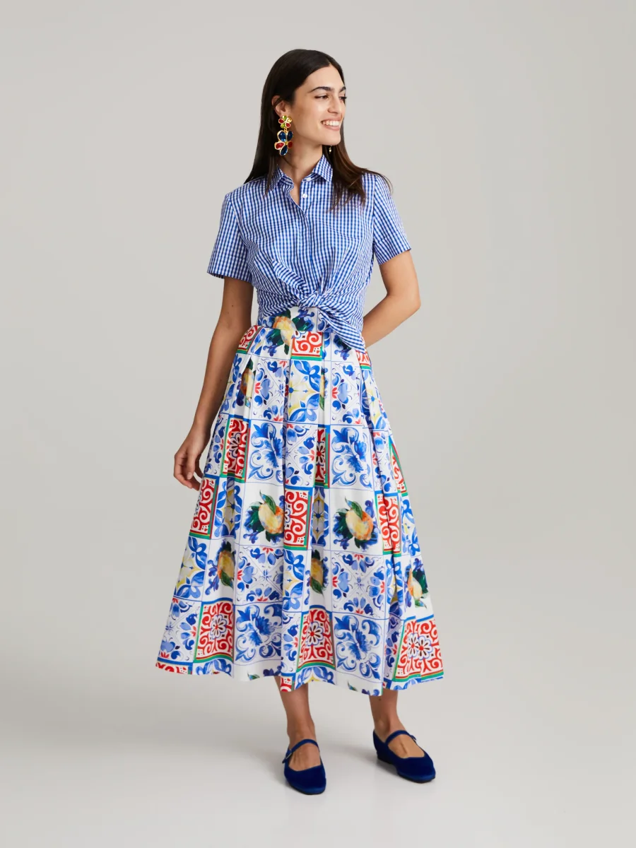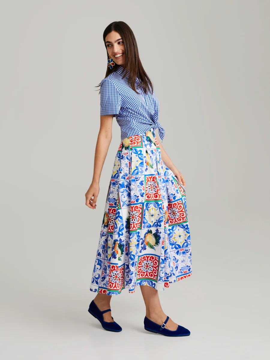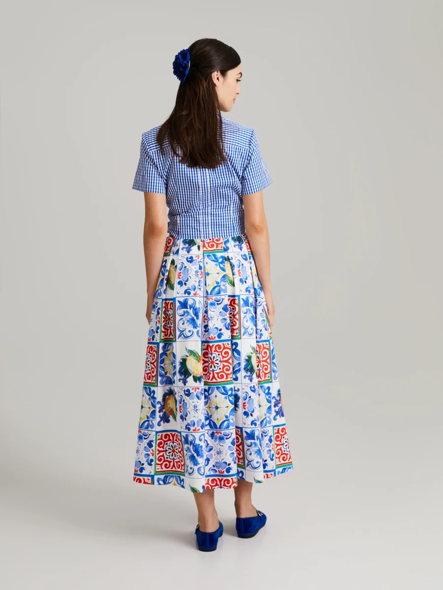 Midiklänning med utsvängd nederkant och dramatiska veck. Dold dragkedja i sidan och knappar vid midjan. Majolica-mönstret, ett verkligt uttryck för italienskt hantverk, hämtar inspiration från de livliga mönstren på mediterransk keramik.Tillverkad i högkvalitativ italiensk bomullssatin.
