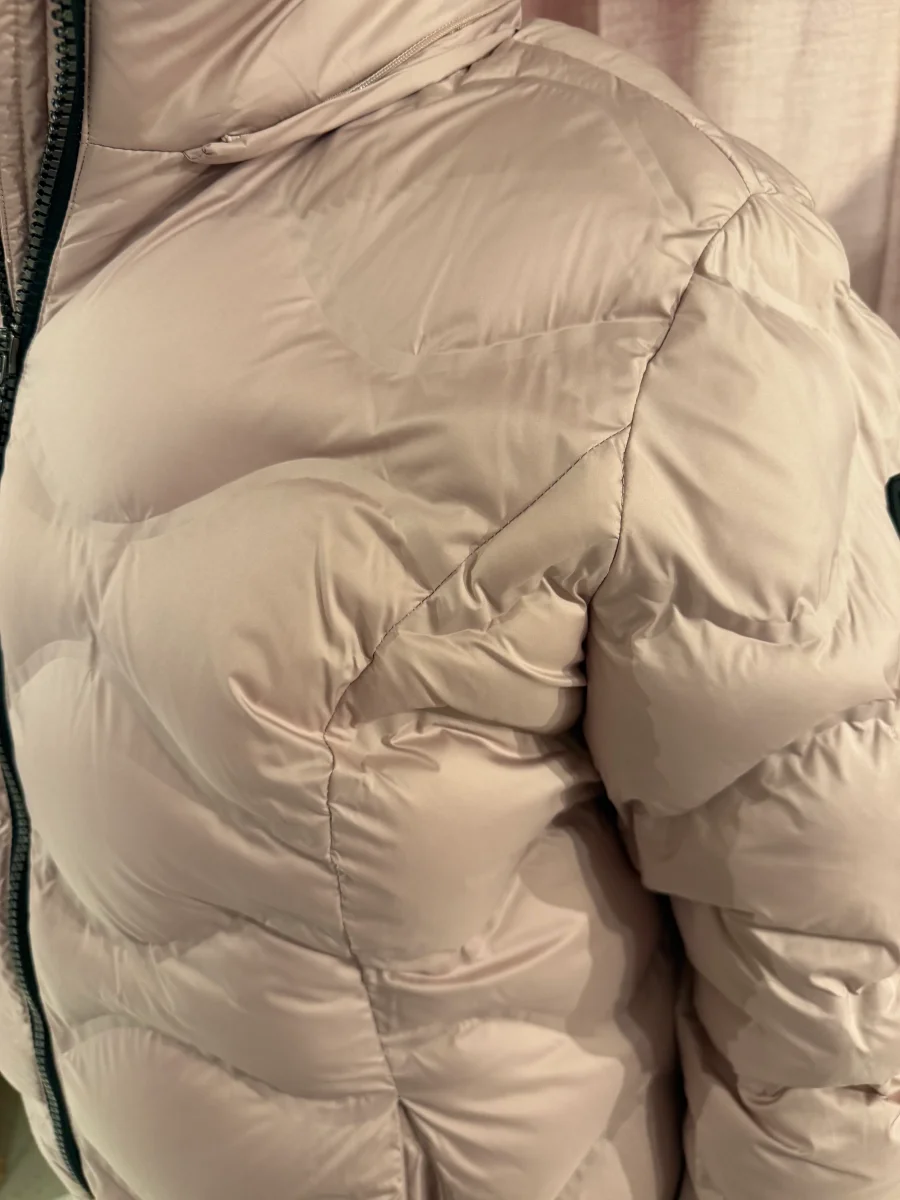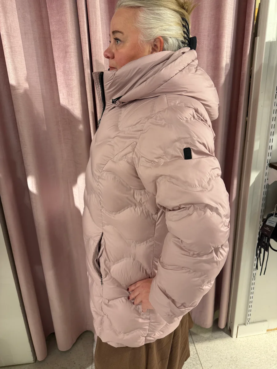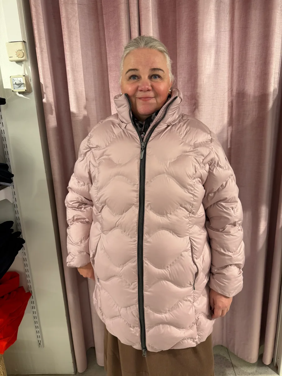 Vinterjacka som håller dig varm hela vintern, det är pudelrosa färg och känns som en dunjacka fast det är syntet.