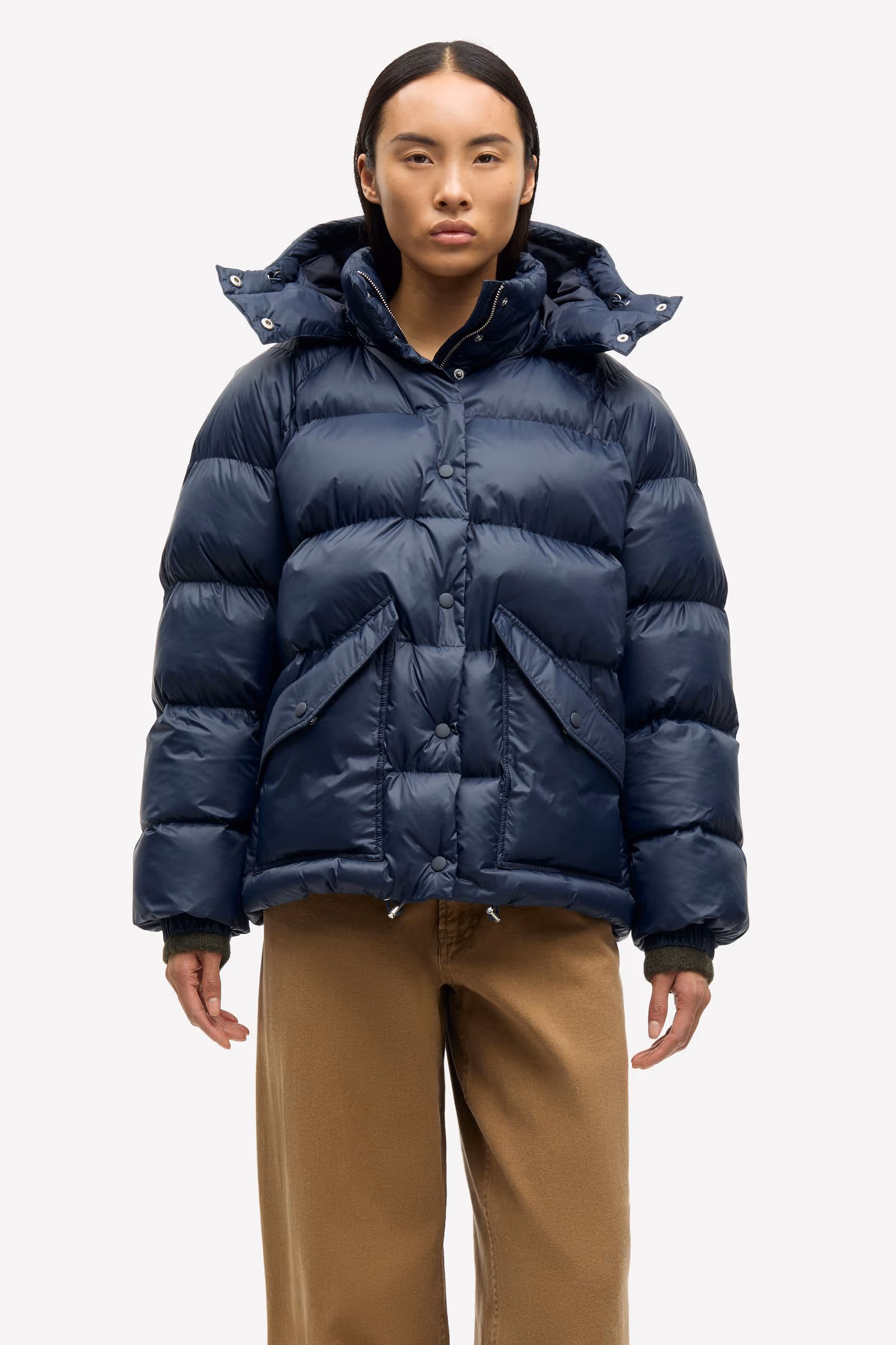 Quilted puffer jacket with a loose fit and high neck. Two-way zipper and snap button closure on the front. Detachable hood with snap buttons. Drawstring closure at the hem. Buttoned patch pockets on the front and patch pocket on the inside. Printed Samsøe Samsøe branding on the back. Padded with THERMORE® Ecodown. Fully lined. Main material made from a blend with recycled polyamide.