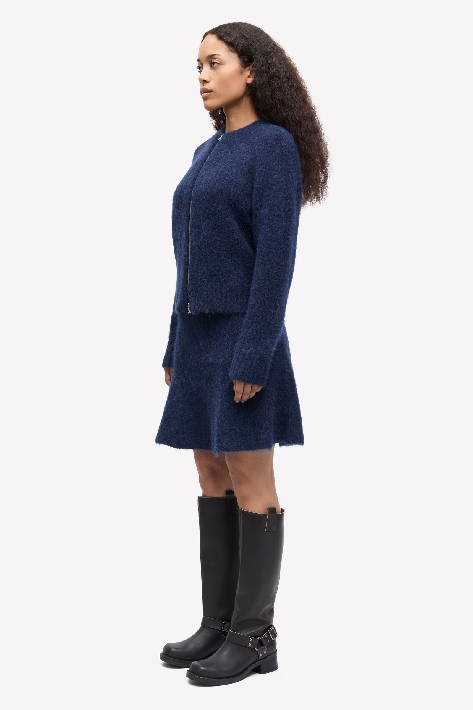 Knitted cardigan with a regular fit. Two-way zipper closure on the front. Rib-knitted collar, cuffs, and hem. Embroidered ø branding at the side. Slightly brushed look. Main material made from an elastic blend including alpaca wool.