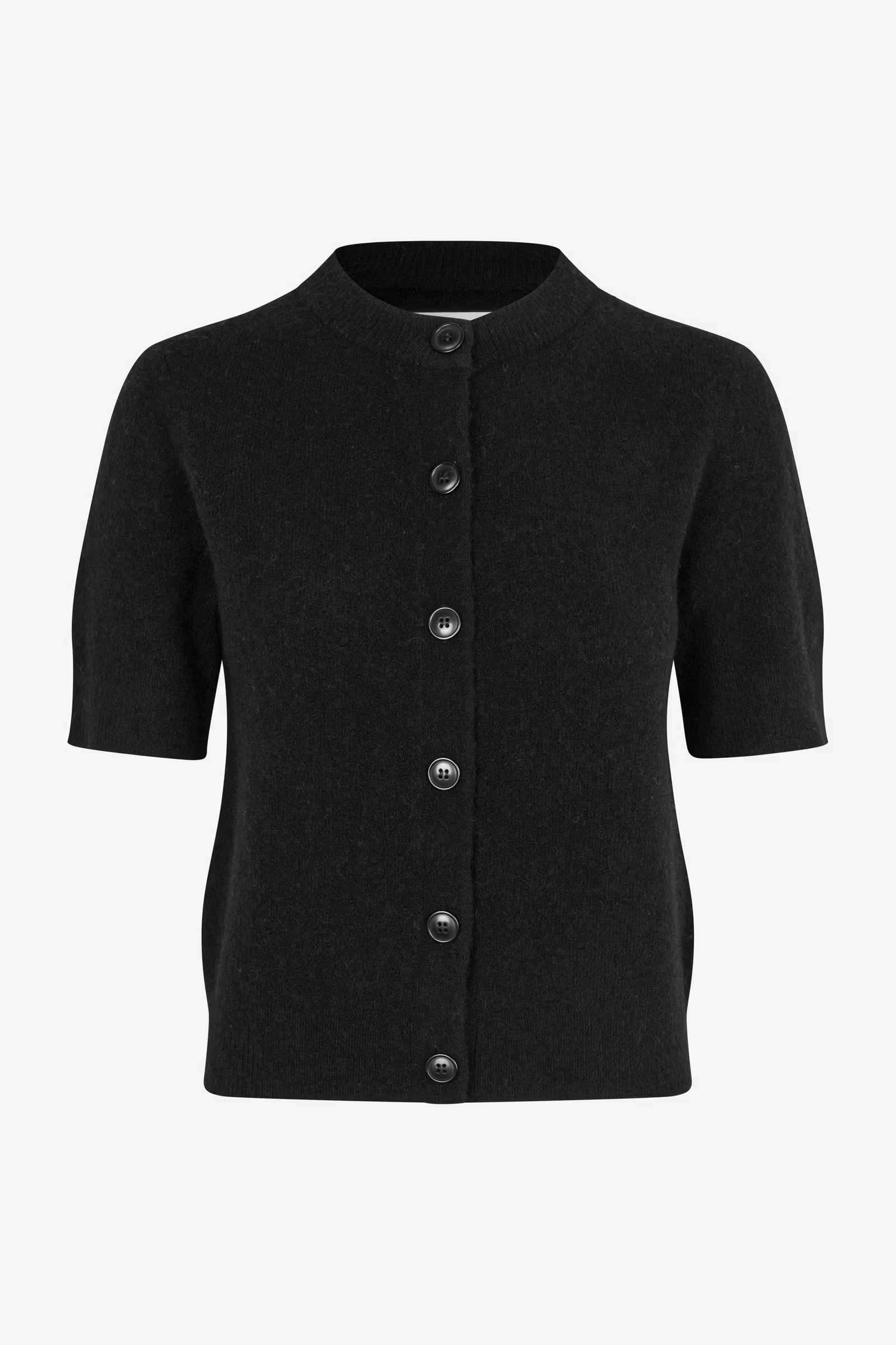 Short-sleeved cardigan with a regular fit. Button closure on the front. Rib-knitted collar, cuffs, and hem. Round neck. Main material made from an elastic blend of wool, alpaca wool, and recycled polyester. This product is RWS certified. The RWS describes and certifies animal welfare and land management practices in wool fibre production and tracks the certified material from farm to final product.