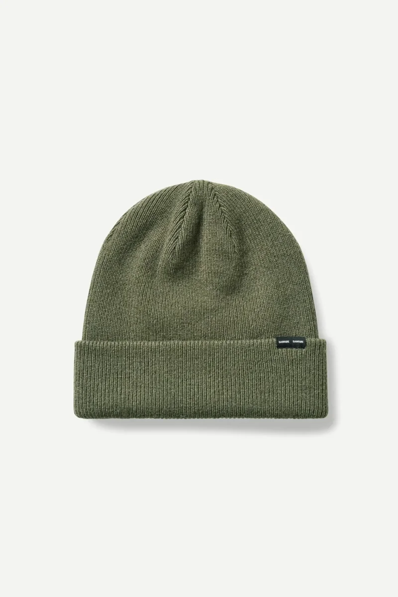 Knitted beanie with a fold. Label with Samsøe Samsøe branding on the front. Main material made from a blend with wool. This product is RWS certified. The RWS describes and certifies animal welfare and land management practices in wool fibre production and tracks the certified material from farm to final product.