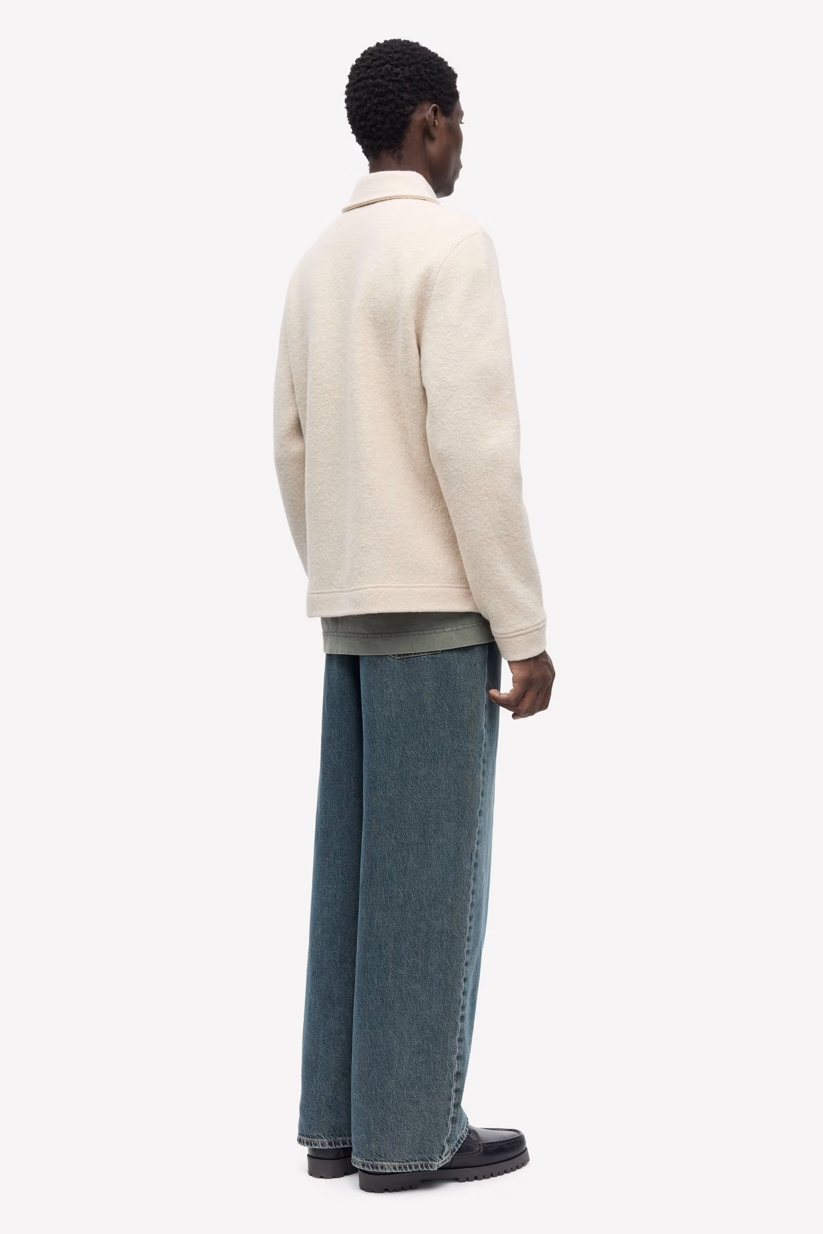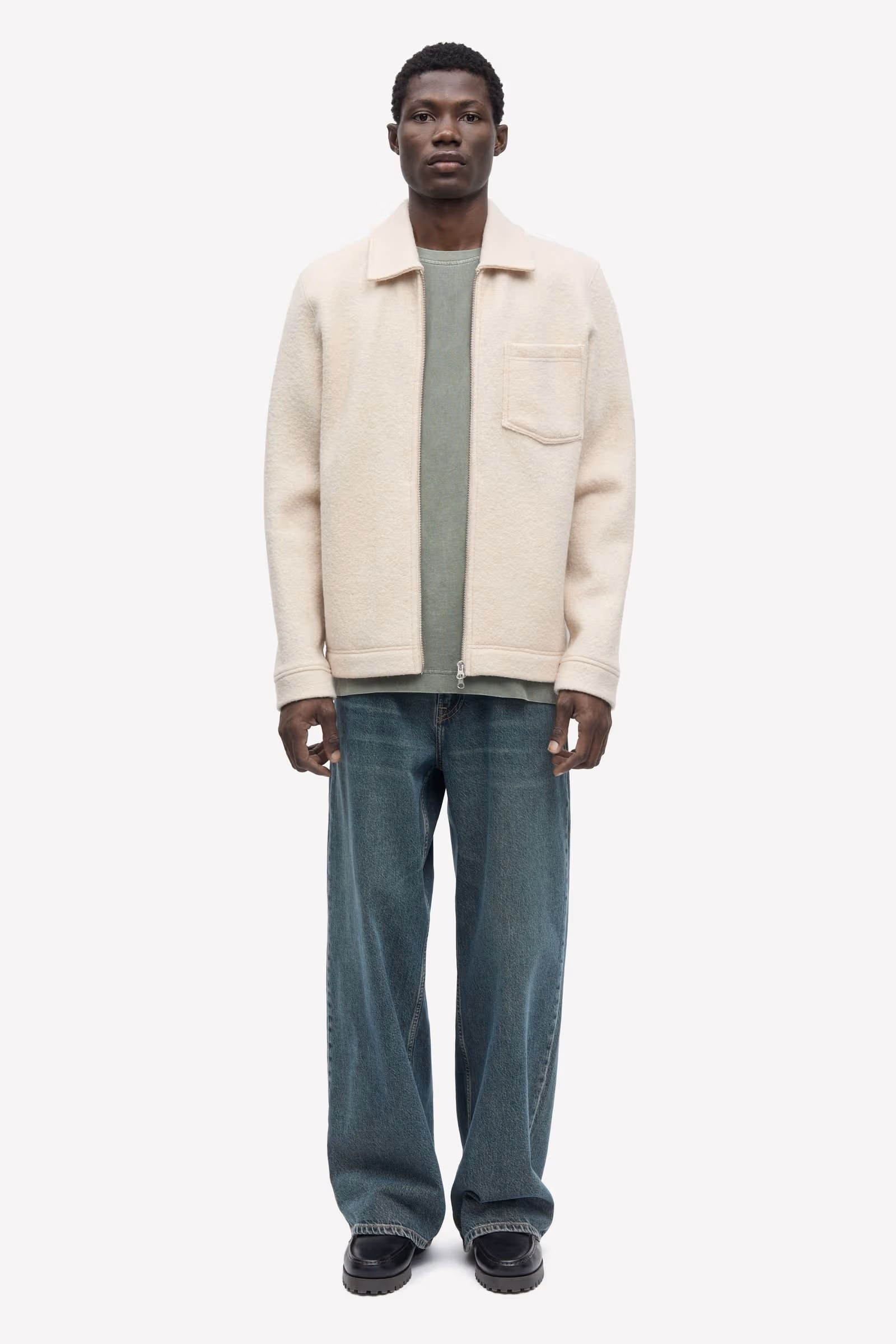 Regular fitting cardigan with a double ended zip fastening. Pointed collar, chest pocket. Felted 100% wool sweatshirt fabric.