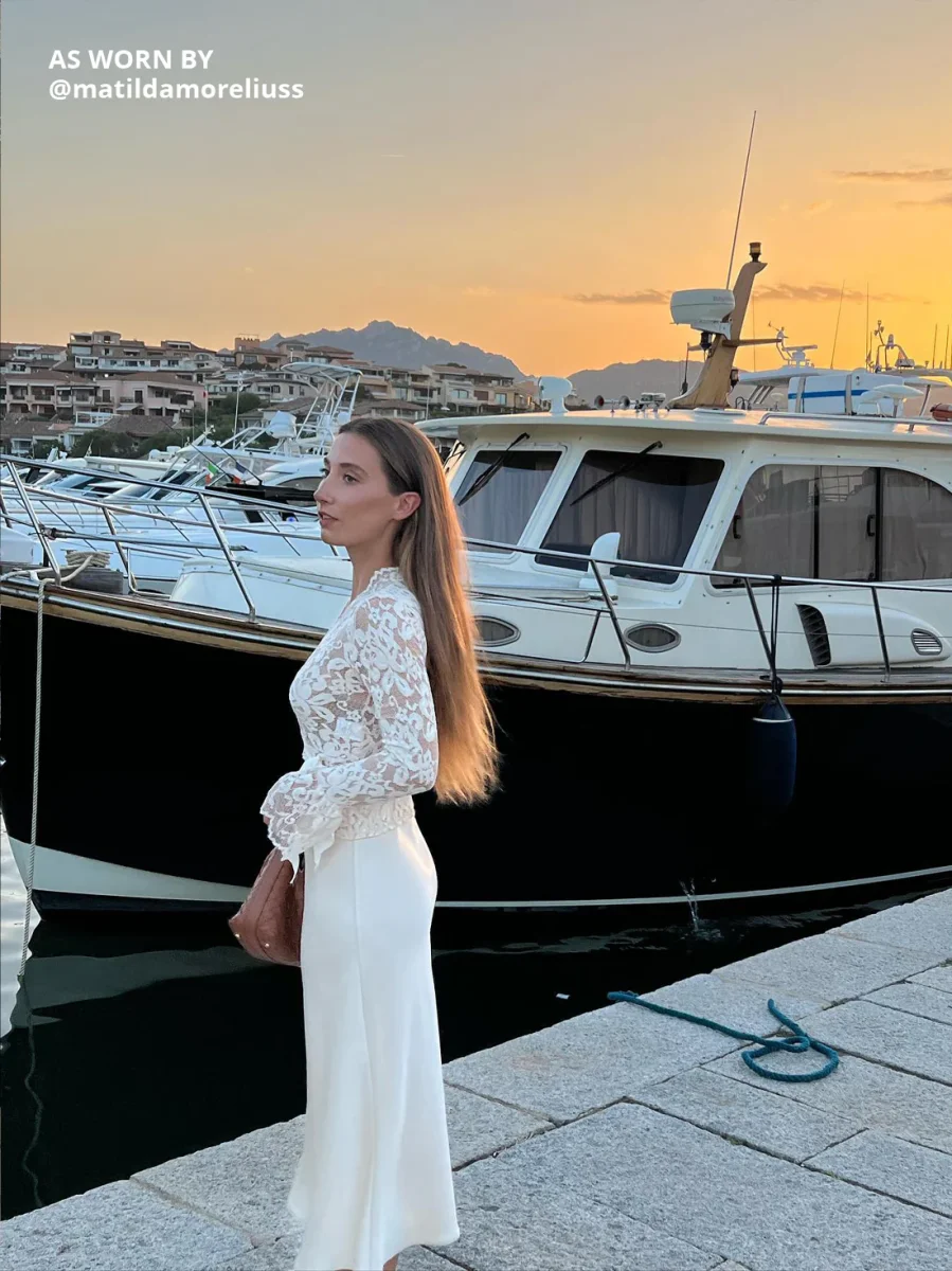 Genomskinlig spetsblus. Långa ärmar med volanger vid ärmslut, bältesögla och omlottband i midjan i matchande färg. Blusen är ofodrad. Kombinera med Mischa-toppen.