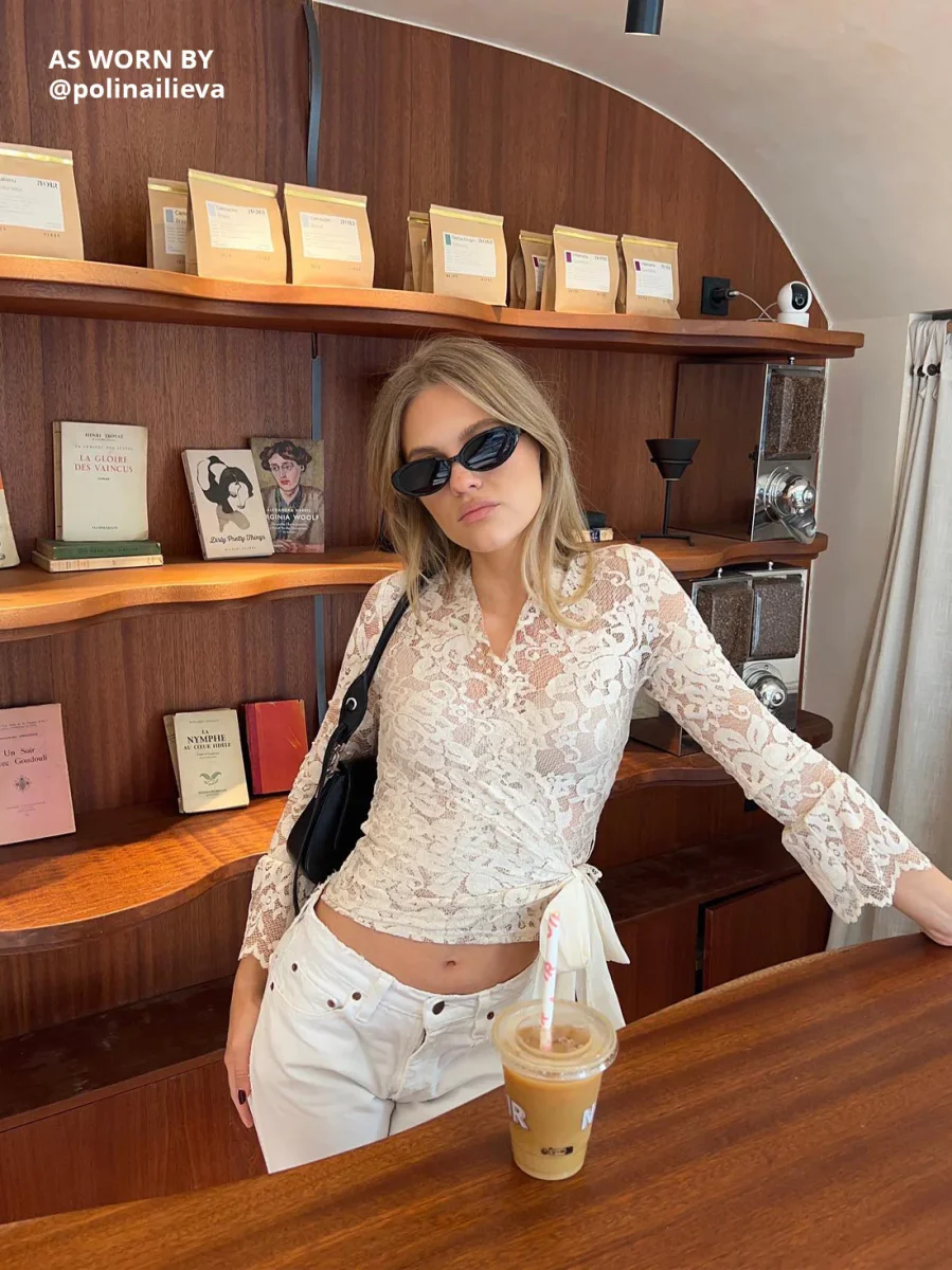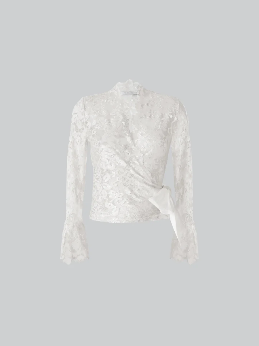Genomskinlig spetsblus. Långa ärmar med volanger vid ärmslut, bältesögla och omlottband i midjan i matchande färg. Blusen är ofodrad. Kombinera med Mischa-toppen.