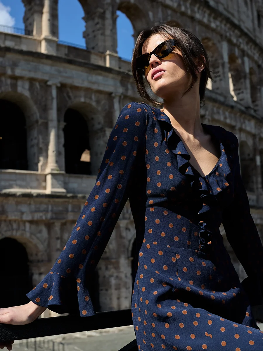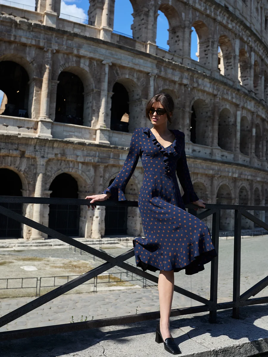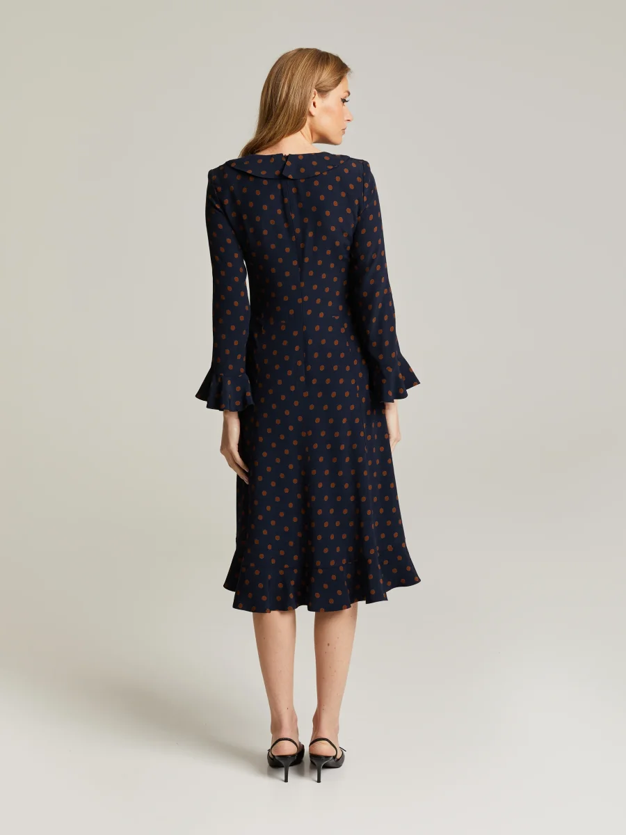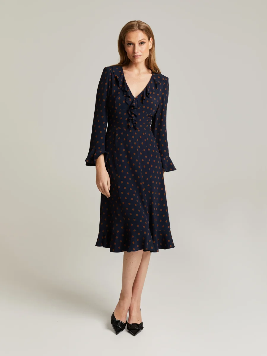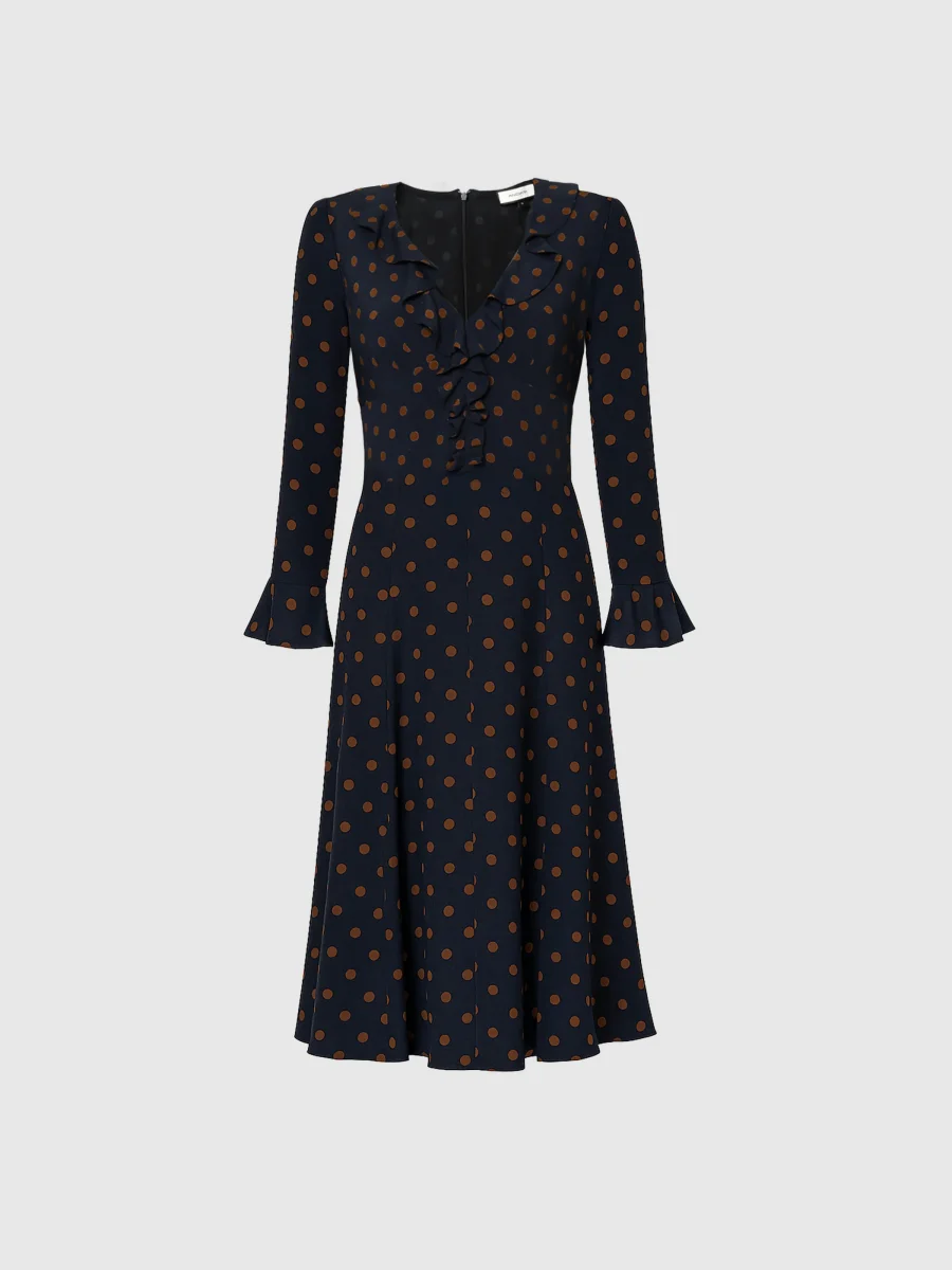 Knälång klänning med feminin silhuett. V-ringning och 3/4-ärmar med volang detaljer. Med foder och dold dragkedja bak. Tillverkad av högkvalitativ italiensk viskoscrepe.
