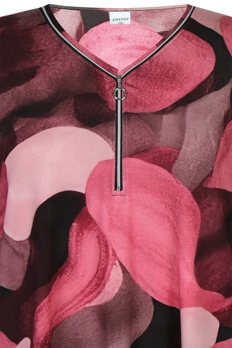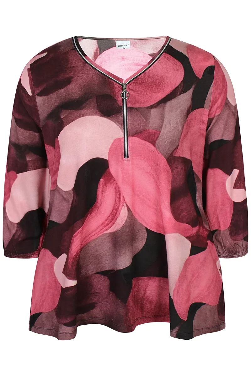 Mjuk, följsam och full av karaktär – den här toppen kombinerar komfort med ett konstnärligt mönster i varma rosa toner.
