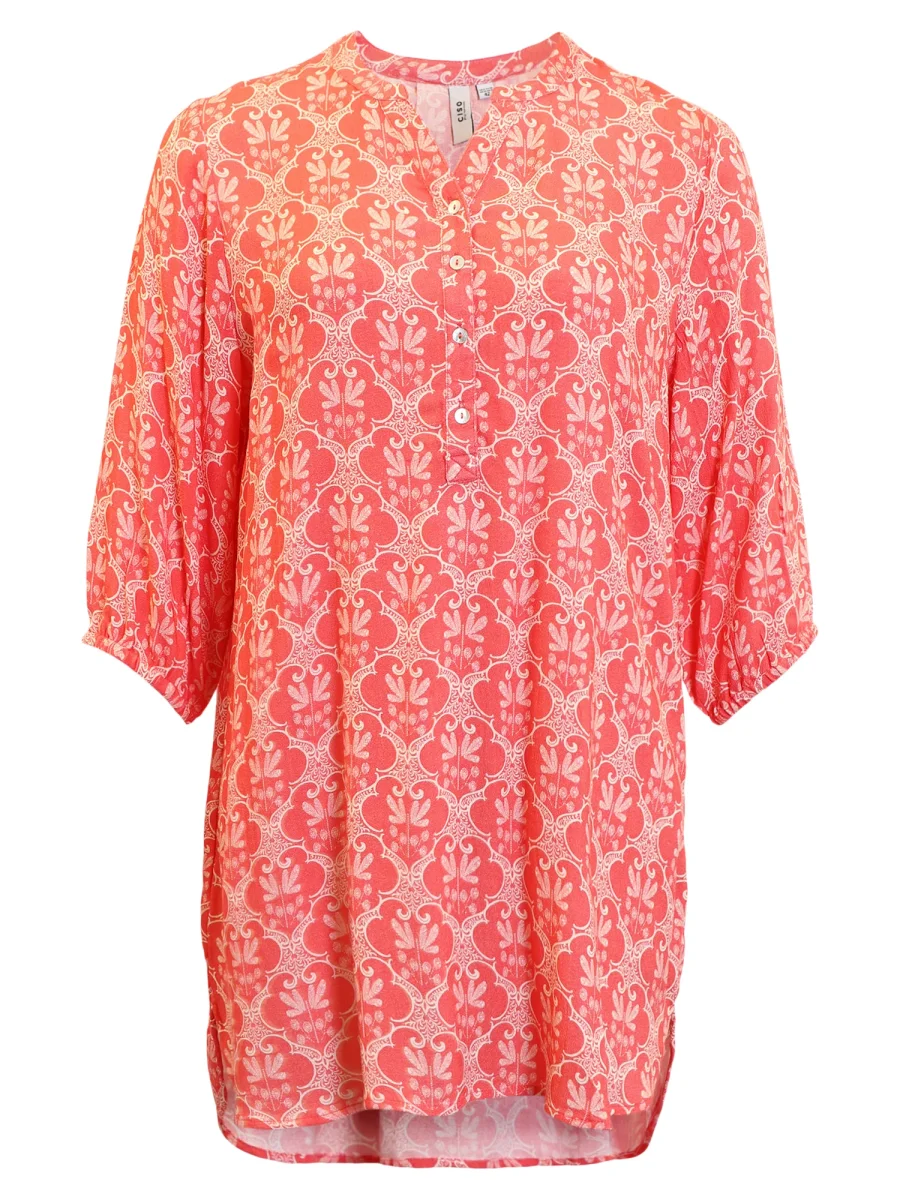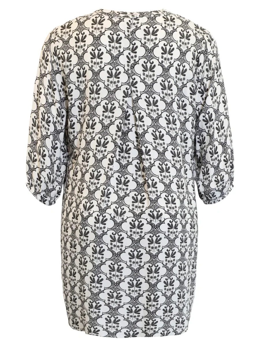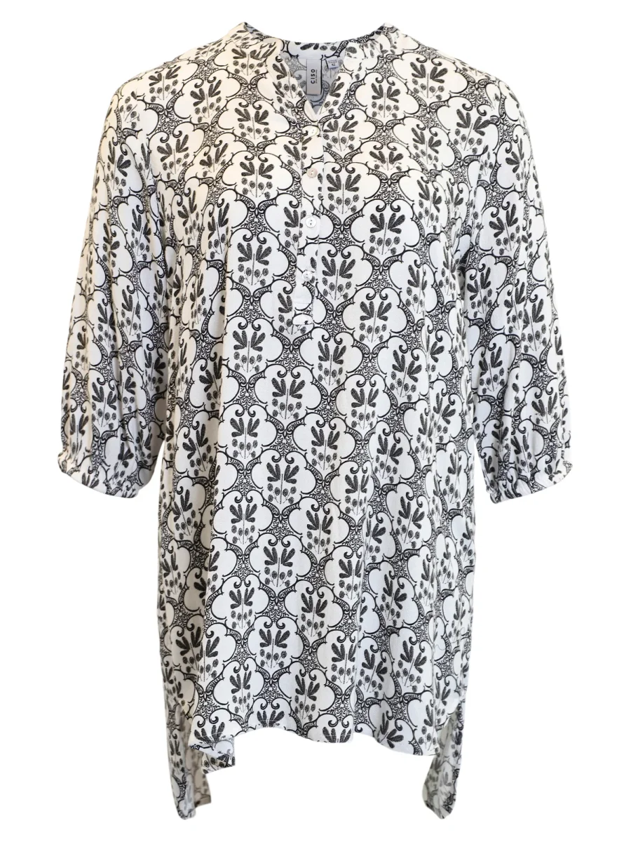 Mönstrad tunika i en härligt livfull print som piggar upp varje garderob. Den luftiga passformen, 3/4-ärmarna och den feminina V-ringningen med knappar framtill ger en avslappnad men stilren look. Perfekt till både jeans och leggings – och finns även i klassiskt svart/vitt för en mer tidlös känsla. Normal i storleken.Material: 100% viskos.