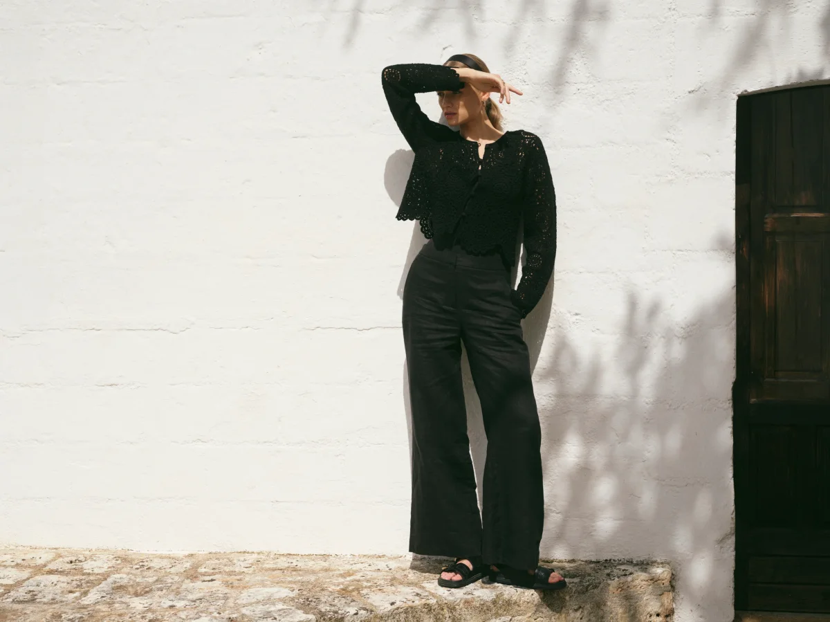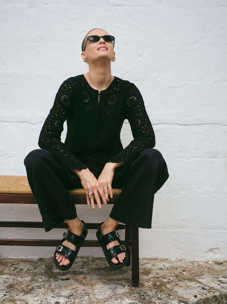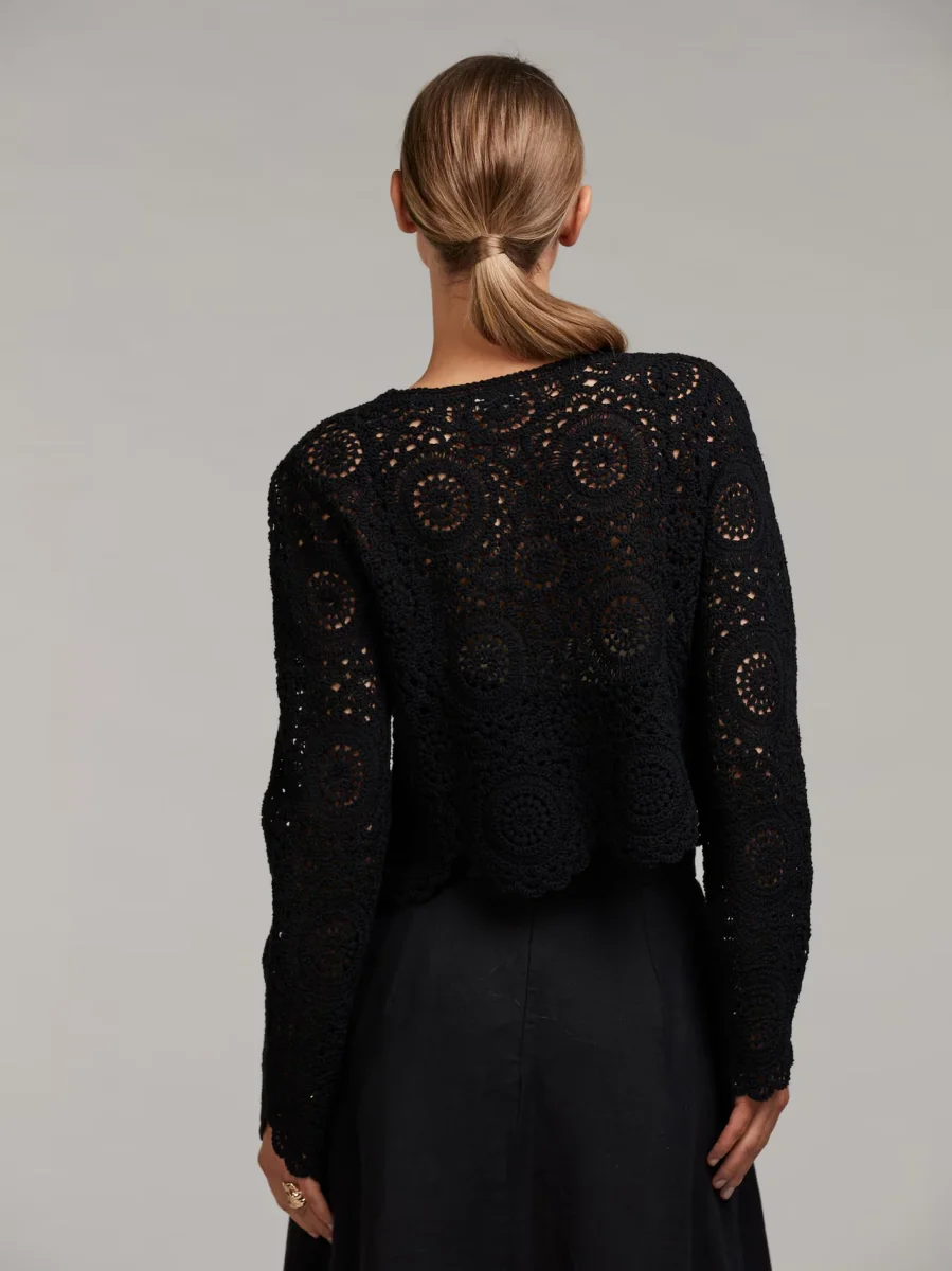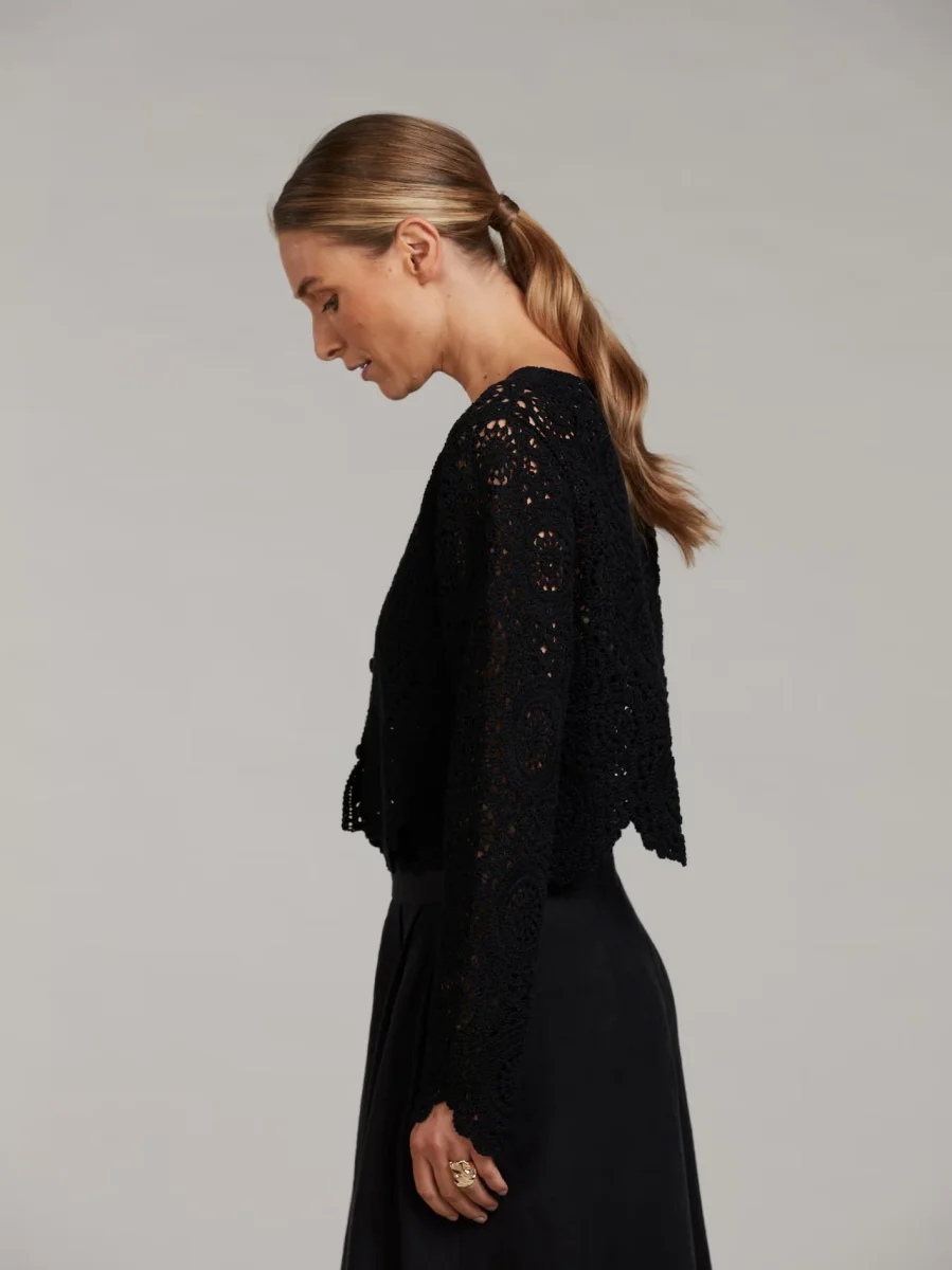 Denna virkade kofta är tillverkad av bomull och är detaljerad med tygklädda knappar
