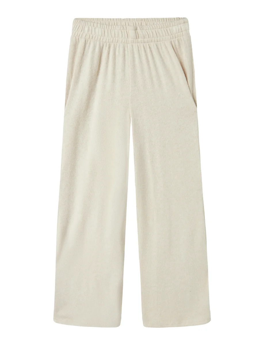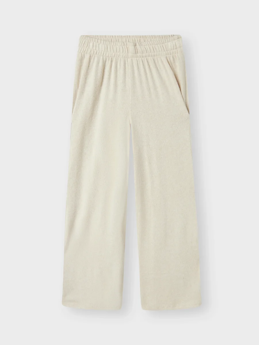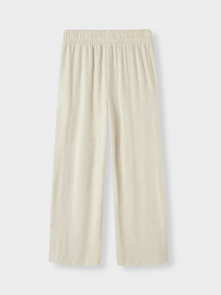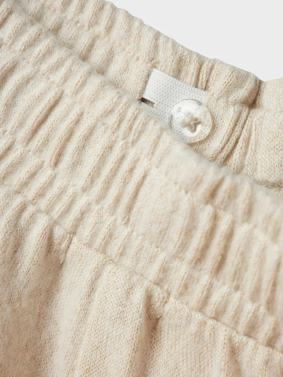Jersey är ett lätt och stretchigt material med mjuk yta och insida som ger en behaglig känsla och god rörelsefrihet. De här beigefärgade byxorna är tillverkade i en supermjuk kvalitet som gör dem extra mysiga att ha på sig – perfekta för både lek och vila. Den vida passformen ger en modern silhuett med gott om plats att röra sig.