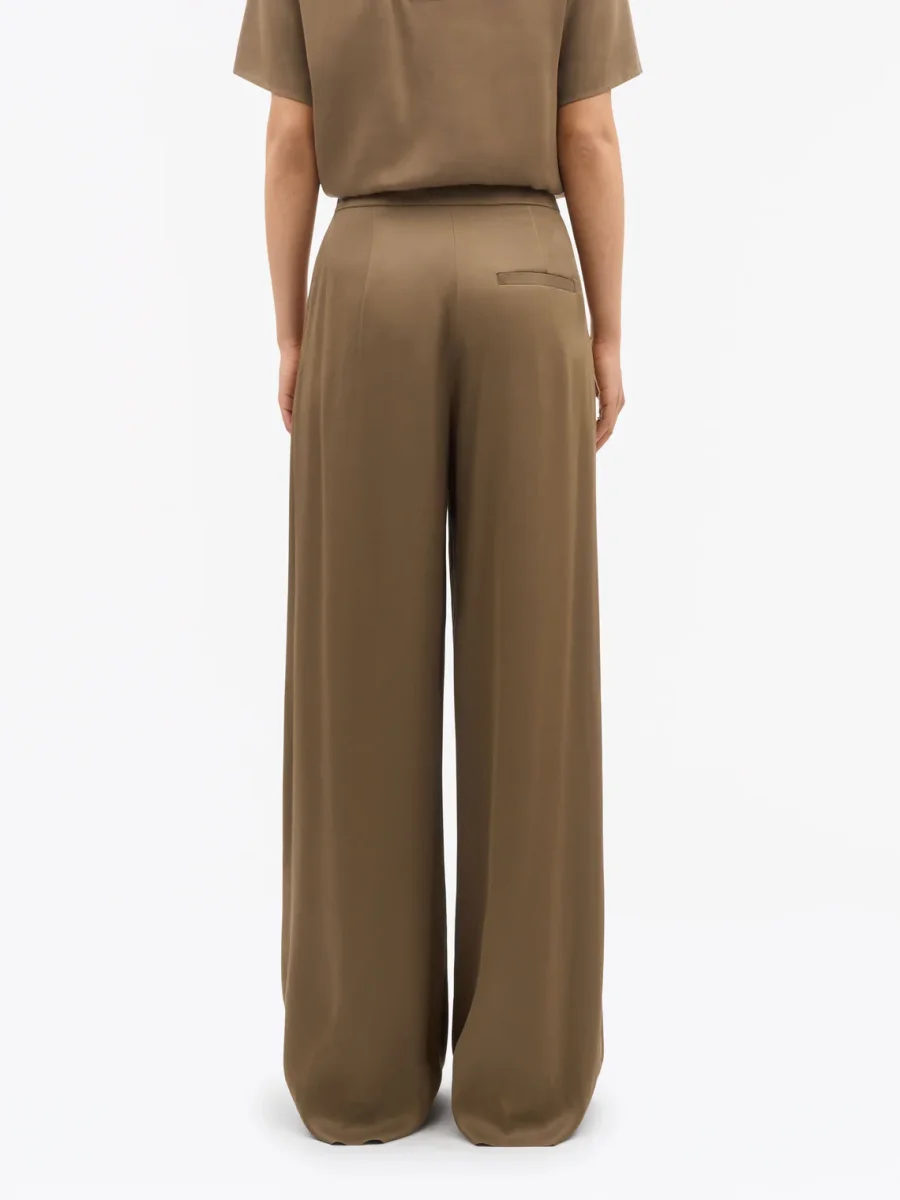 Cora är högmidjade maxibyxor med djupa veck och vida ben, tillverkade av en viskosblandning. De har sneda sidfickor och bakfickor med kantband och avslutas med en vanlig vikad fåll som gör det enkelt att justera längden.