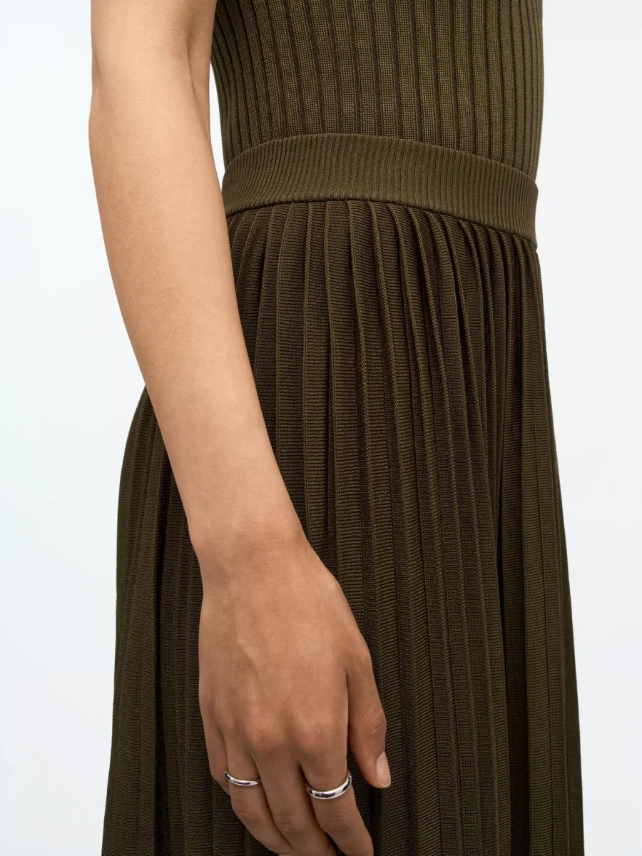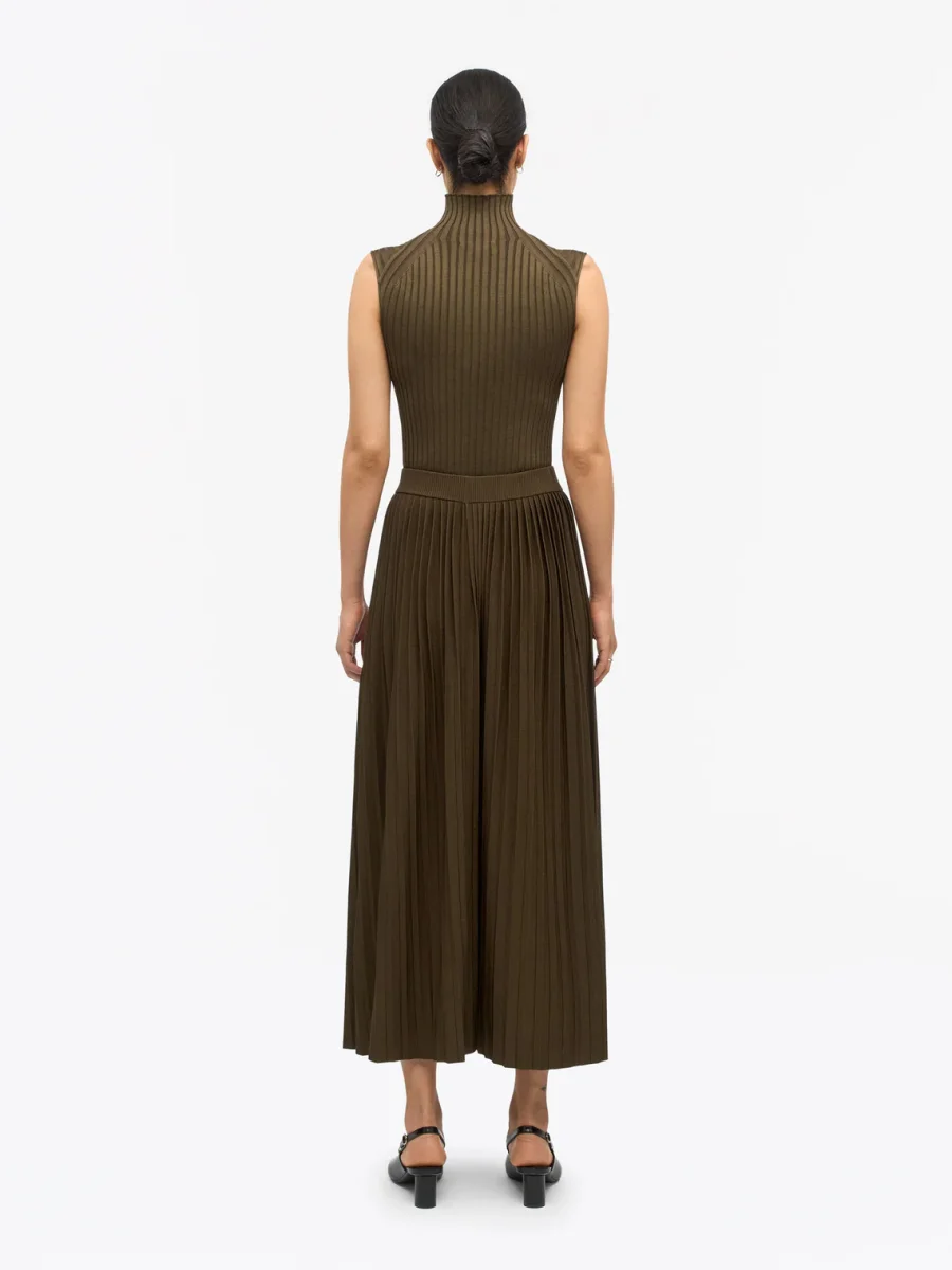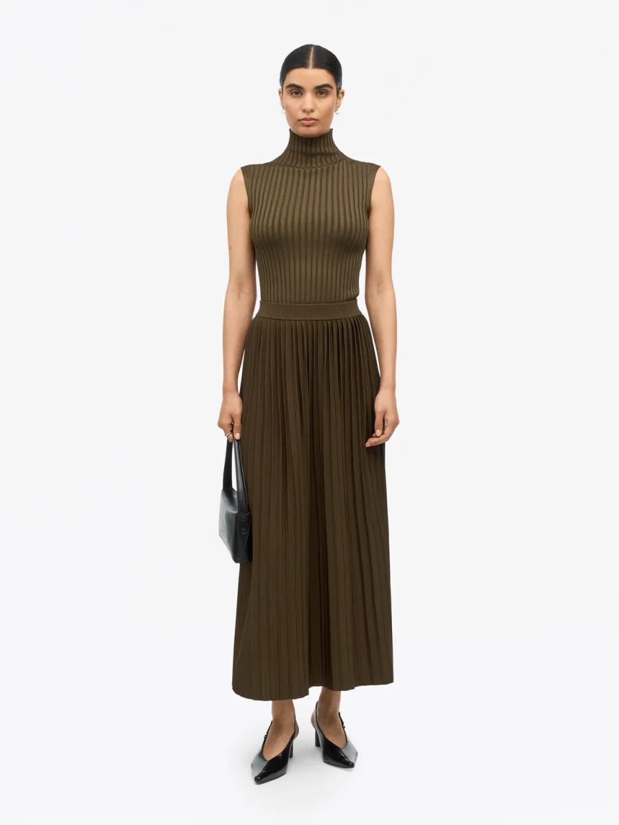 The Olivia pleated skirt is crafted from a soft viscose blend, designed with timeless elegance in mind. Falling at calf length, this mid-waisted, classic pleated skirt offers effortless sophistication for everyday wear. The integrally knitted waistband ensures a comfortable fit, while the skirt itself is knitted in a smooth jersey stitch for graceful movement and flow. Unlined for lightness, Olivia combines modern comfort with a refined silhouette.