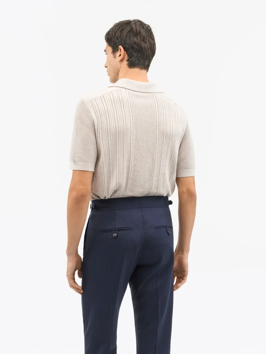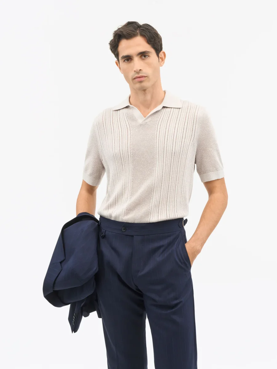 Eoin P är vår åtsittande, höftlång rundhalsad tröja tillverkad av en finstickad blandning av merinoull och linne för en avslappnad look. Bål, ärmar och krage är alla tillverkade i helstickad stickning, vilket ger plagget en ren, raffinerad struktur, medan de ribbade ärmsluten ger en subtil touch av textur för att fullända designen.