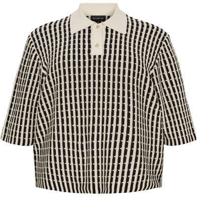 En trendig topp i stilren offwhite med svarta grafiska ränder som ger ett modernt och exklusivt uttryck. Den klassiska kragen och den avslappnade passformen skapar en perfekt balans mellan uppklätt och bekvämt. Ett mångsidigt plagg som enkelt lyfter din vardagslook med en sofistikerad touch.
