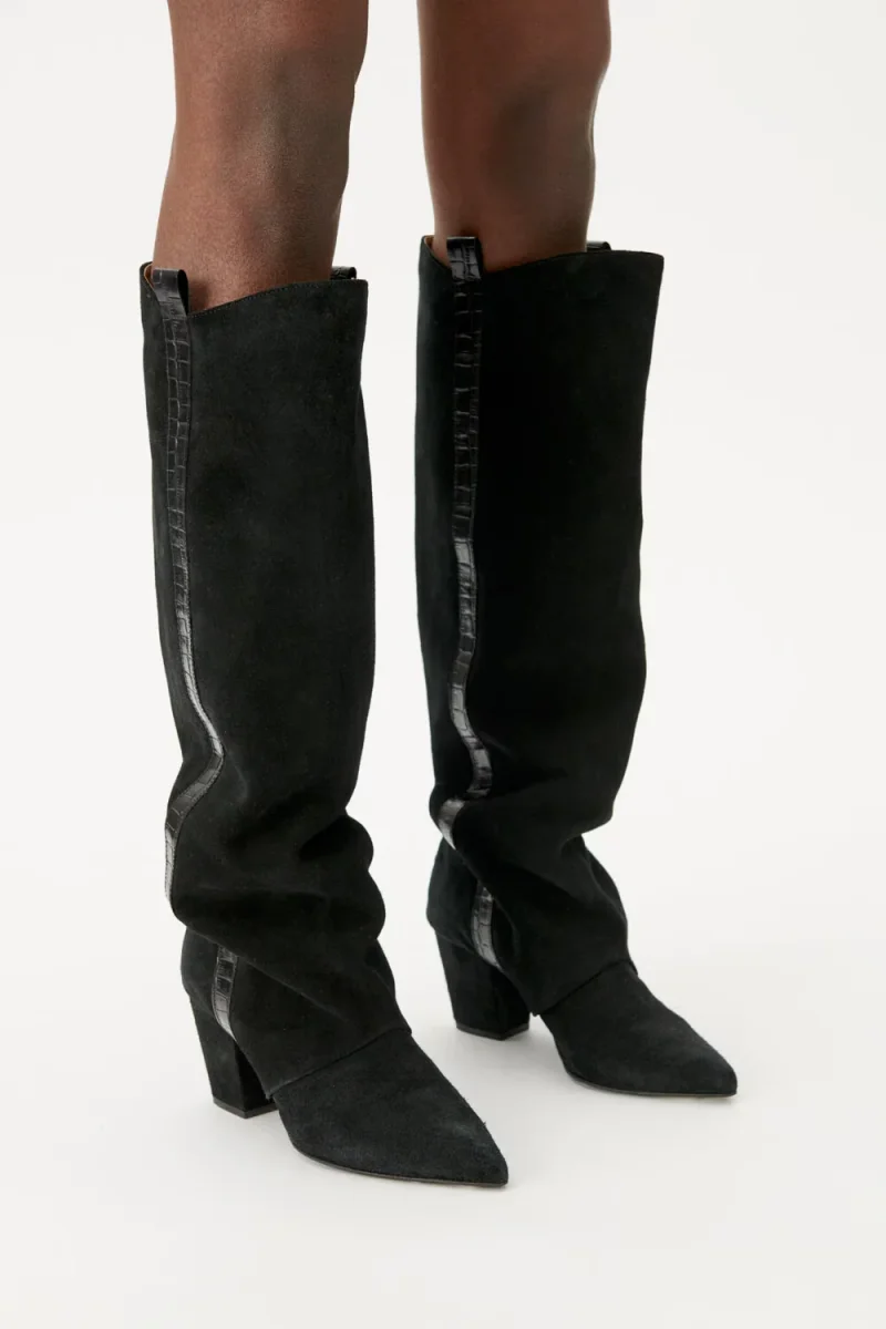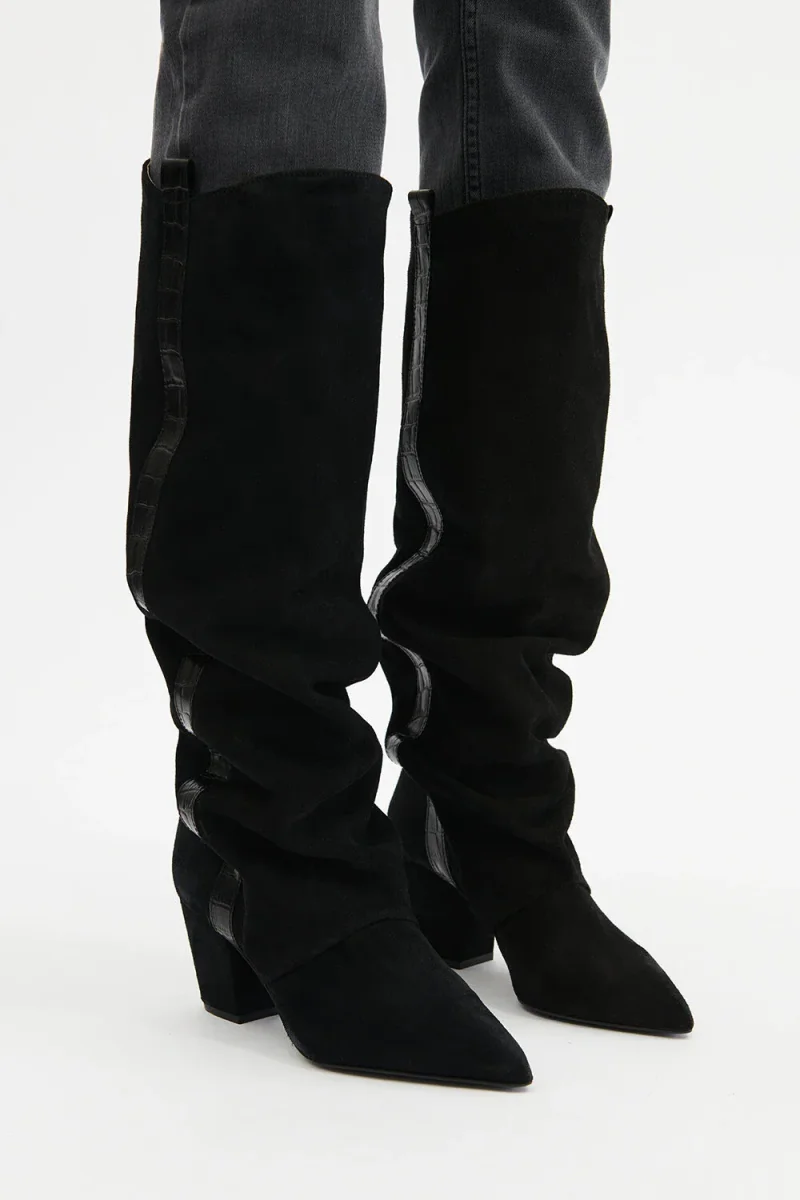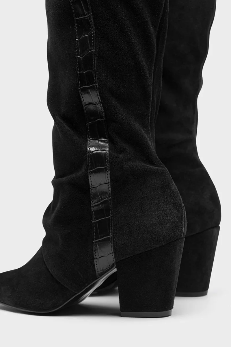 Bonn is a black suede high boot with a PU leather side strap detail. It has a pointed toe and a wide and long shaft to wear, either slouched or straight.