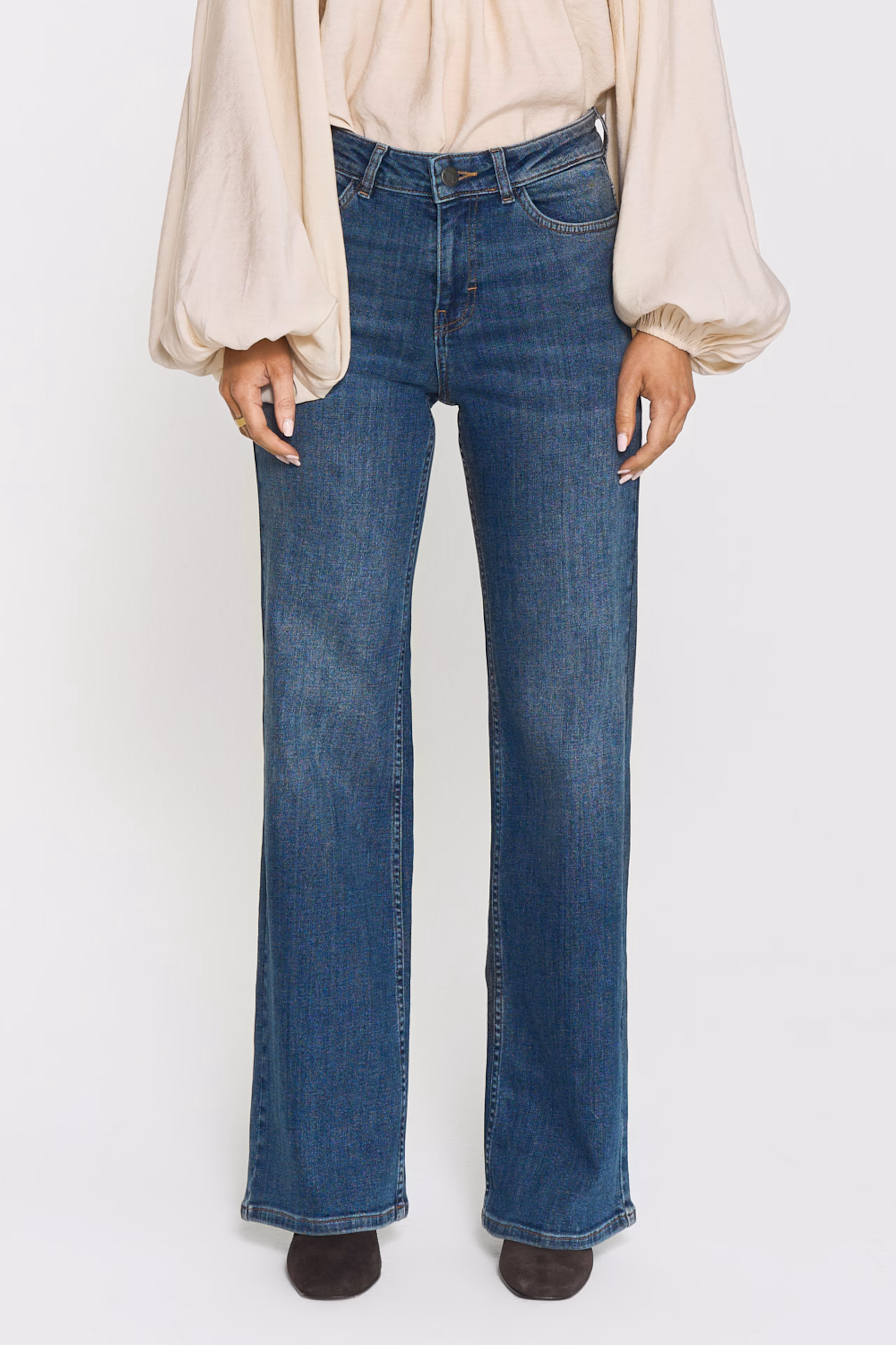Our Nora jeans feature a mid-rise waist, slim-fit and bootcut legs. Four pockets and belt loops. The popcorn effect fabric adds texture and personality.