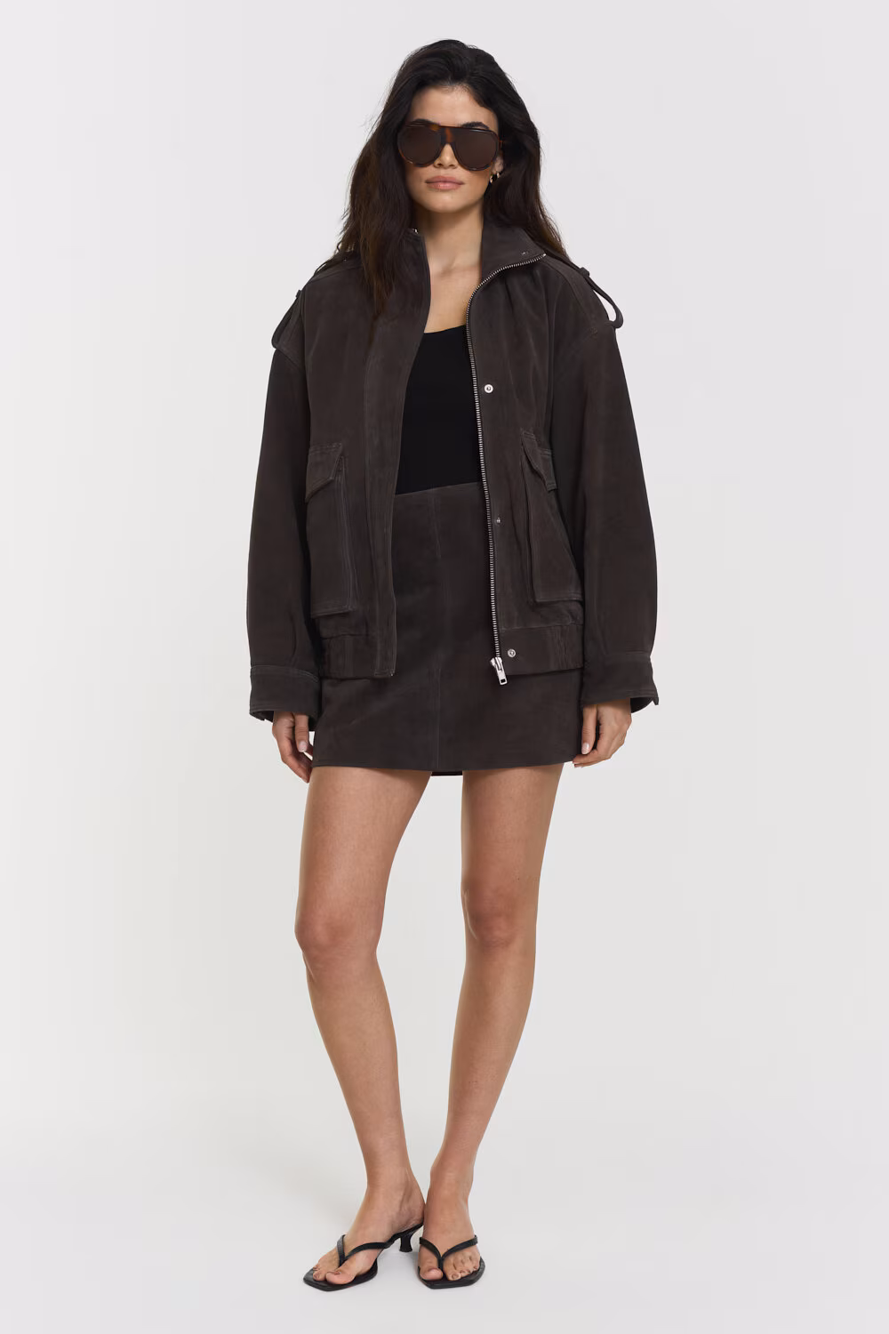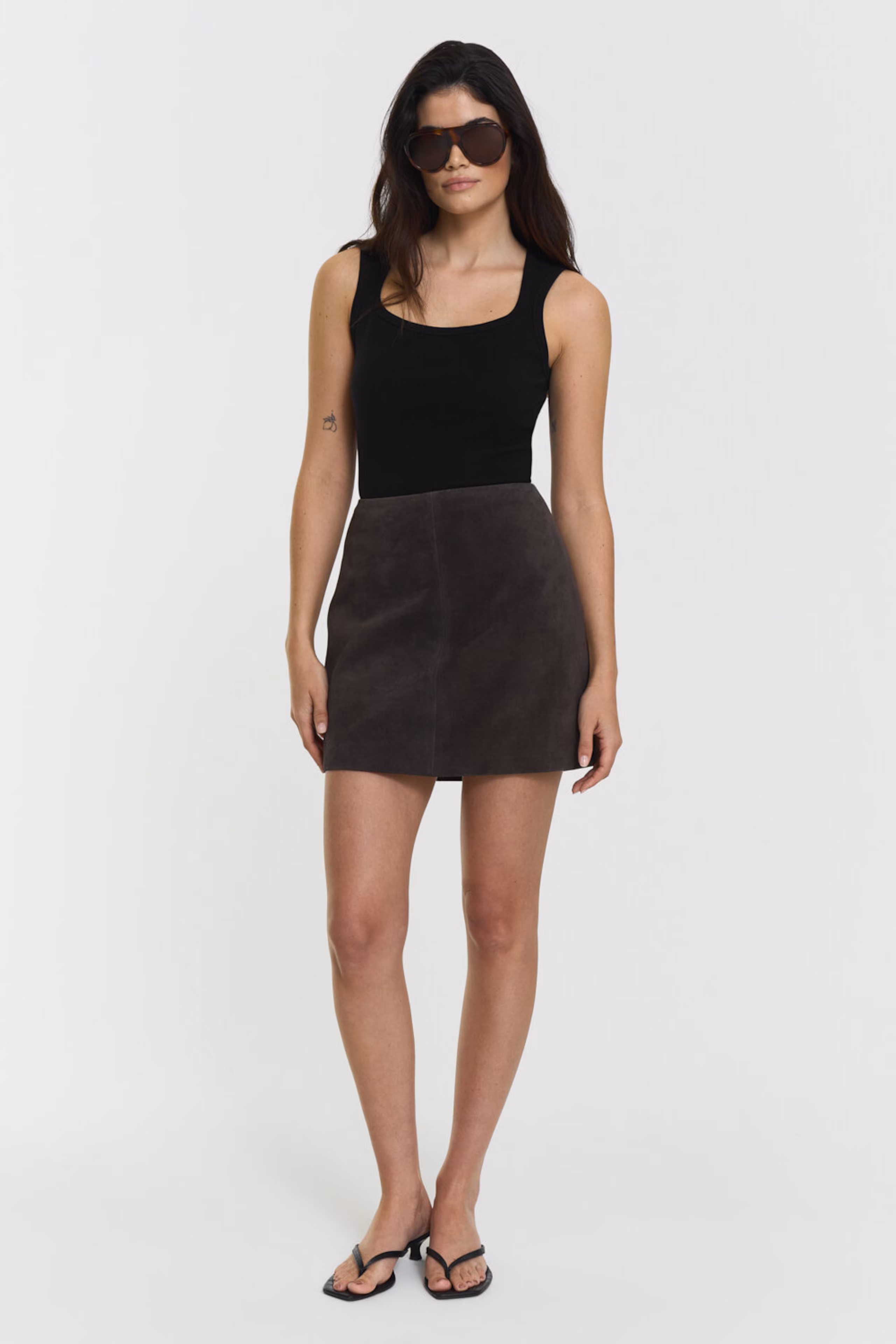 The Hollow Skirt is a sleek mini crafted from 100% suede. Fully lined with a clean zip closure, it’s a bold yet refined piece that adds edge and elegance to any look.