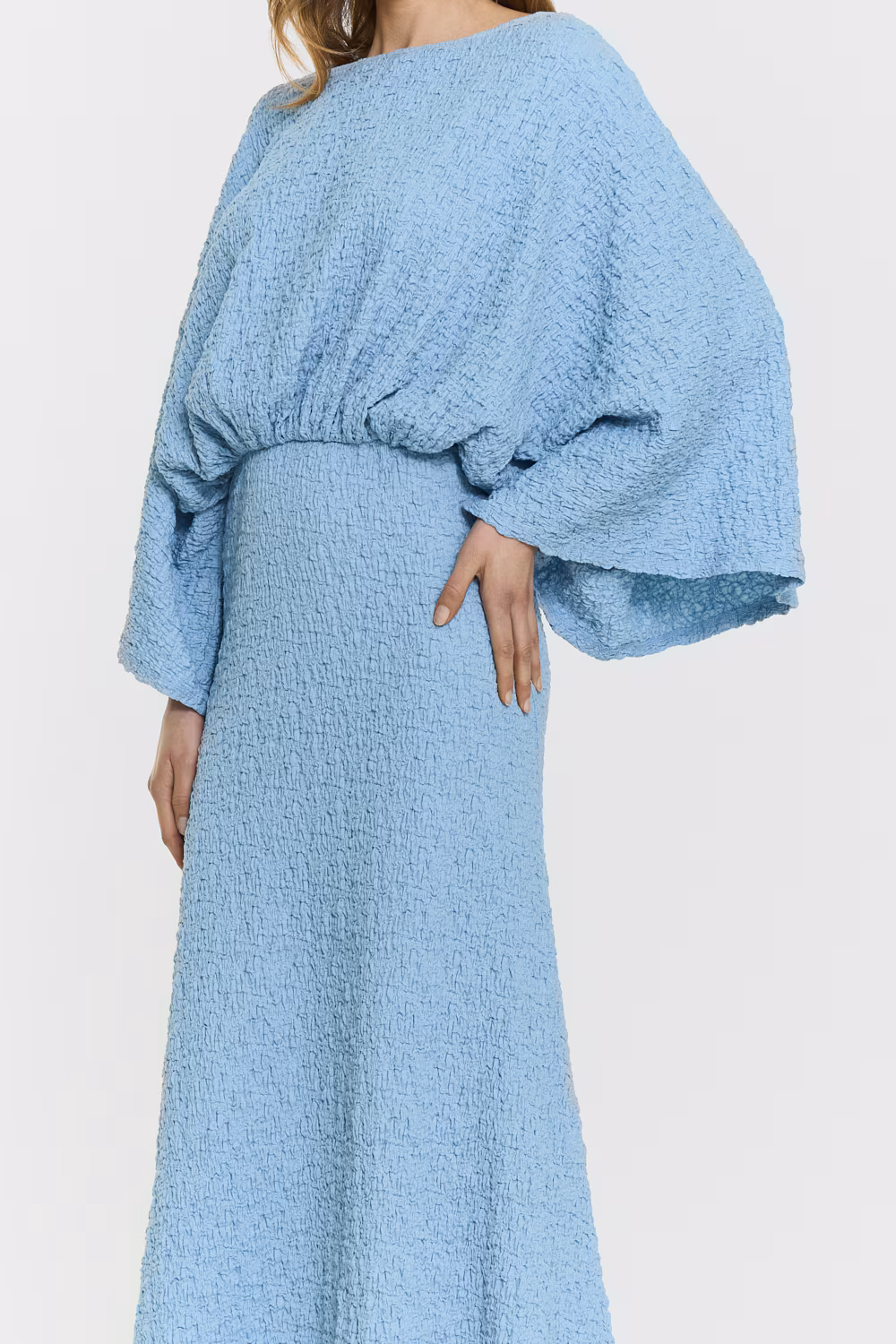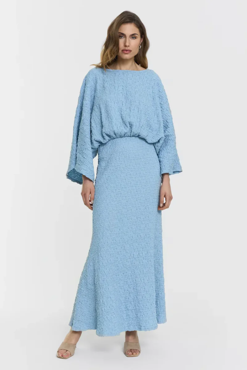 The Alessia Dress features a flattering inserted elastic waist, elegant wide sleeves, and a boat neckline. The creased texture adds a refined touch to the fluid silhouette. Model is 176 cm tall and is wearing size S.