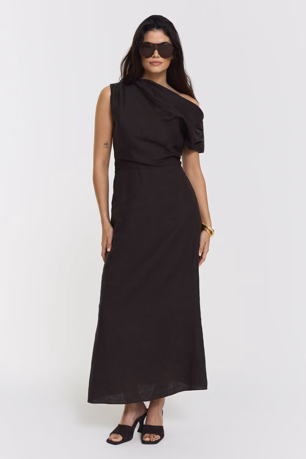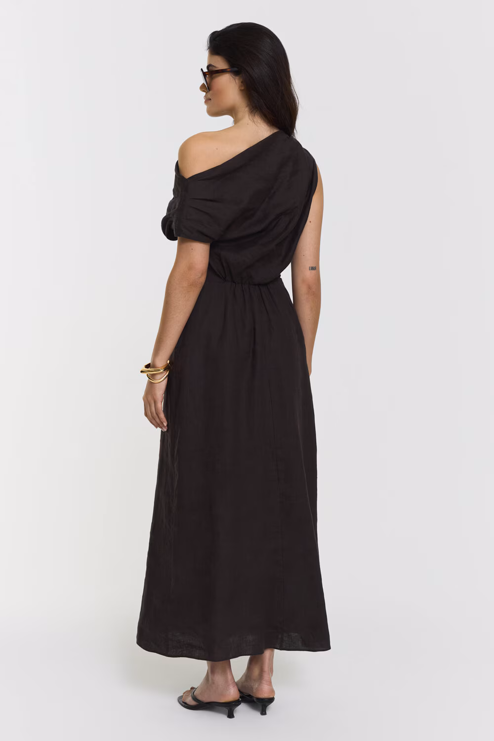 Experience effortless elegance with the Reina Linen Dress. Crafted from 100% long fiber linen, it features a one-shoulder design and a long midi length. Fully lined with a hidden zip at the back for a refined finish.
