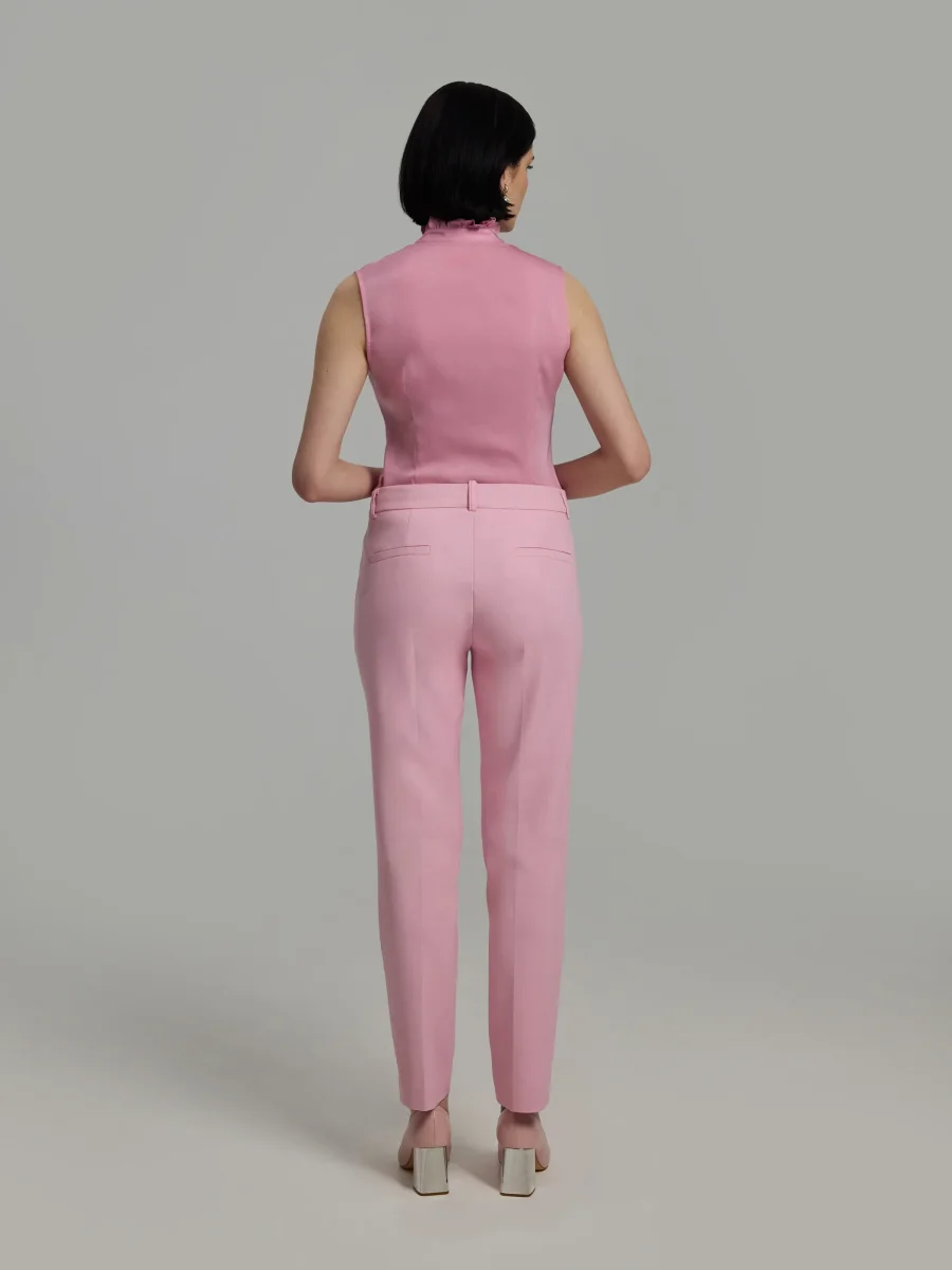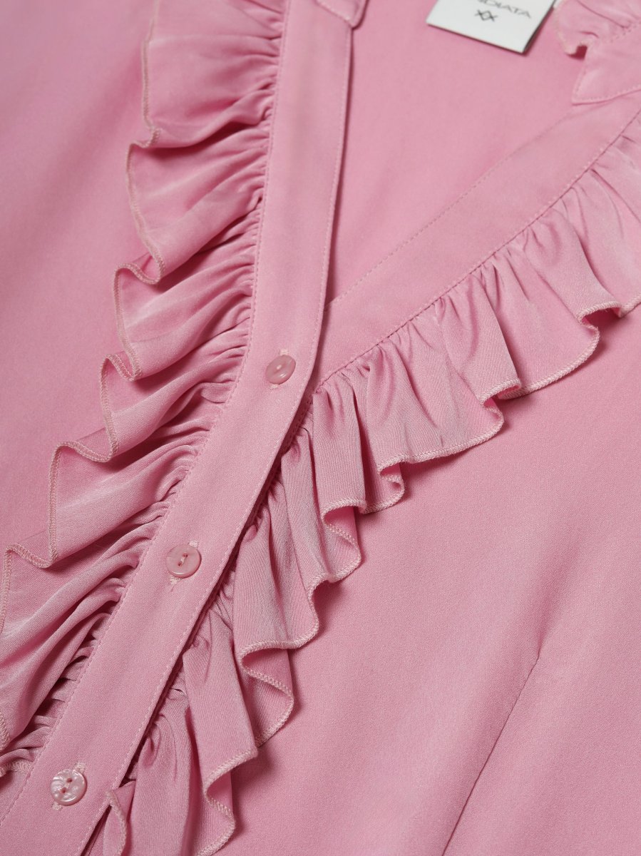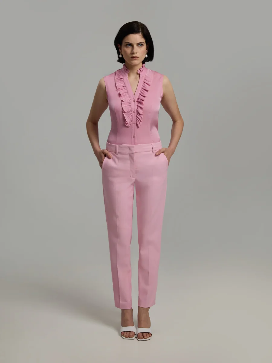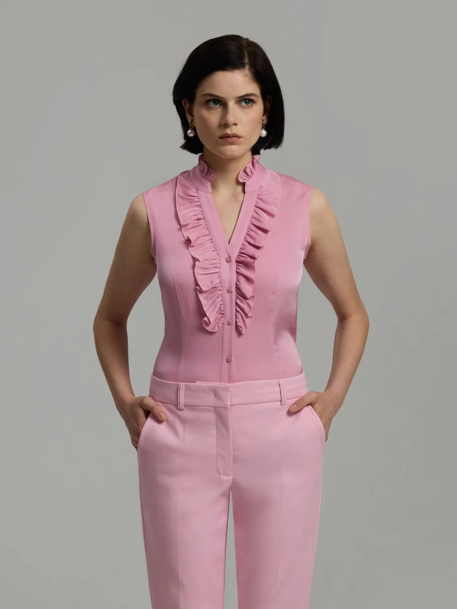 Fitted silhouette in silk with stretch. Sleeveless cut with a ruffled neckline and front button closure. Designed with ruffle detailing along the placket. Pair with the matching Jamy trousers.