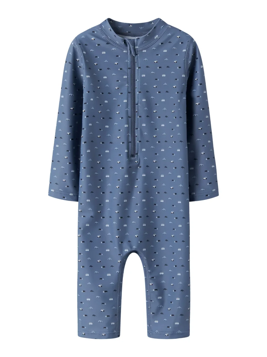 Dräkten är tillverkad i ett snabbtorkande och stretchigt material som passar perfekt för lek och bad. Dragkedjan gör den enkel att ta på och av.