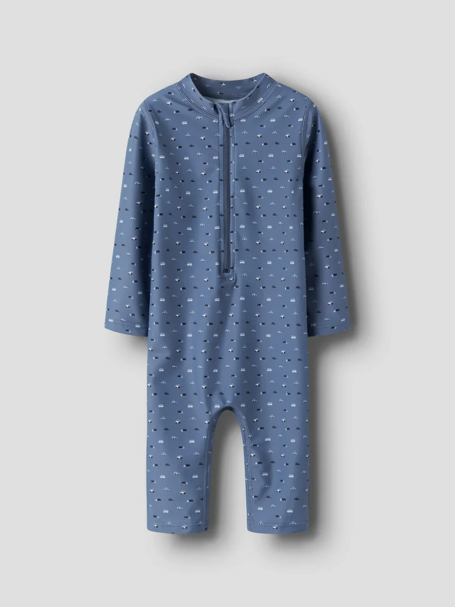 En praktisk och bekväm UV-dräkt i fin blå färg som skyddar barnet under soliga dagar vid stranden eller poolen. Den smarta designen med längre ärmar och ben ger extra skydd mot solens strålar samtidigt som den är bekväm att röra sig i.