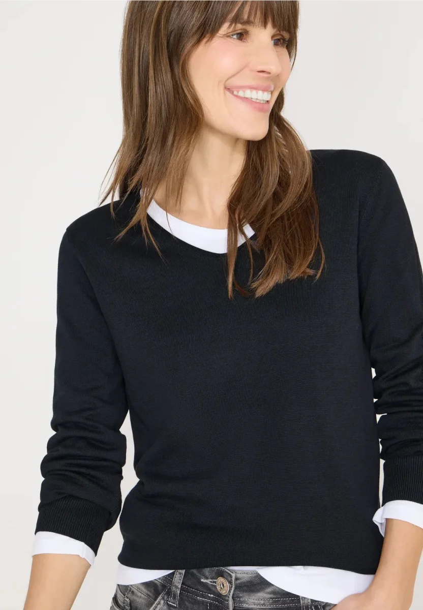 Denna stickade damtröja från CECIL, med sin V-ringning och mjuka bomullsblandning, är ett verkligt bekvämt plagg. I enfärgad och med klassiska ribbade muddar och fåll, matchar den perfekt med jeans eller kjol. Ett bekvämt basplagg för din garderob.