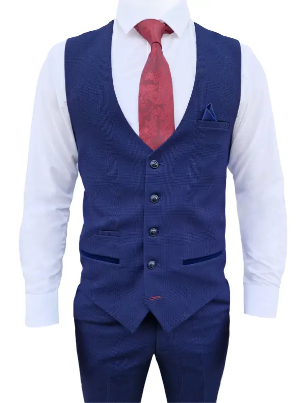 Vårt 3-delade mörkblåa kostym är det perfekta valet för den modebewuste mannen som vill vara stilig. Kostymen har ett enkelt rutmönster som ger en subtil men ändå iögonfallande look. Insidan av kavajen är avslutad med marinblåa och lila detaljer, vilket ger en extra touch av lyx. Även västen har många lila och marinblå detaljer, vilket ger en harmonisk helhet. Denna kostym är tillverkad av högkvalitativa tyger och är bekväm att bära.