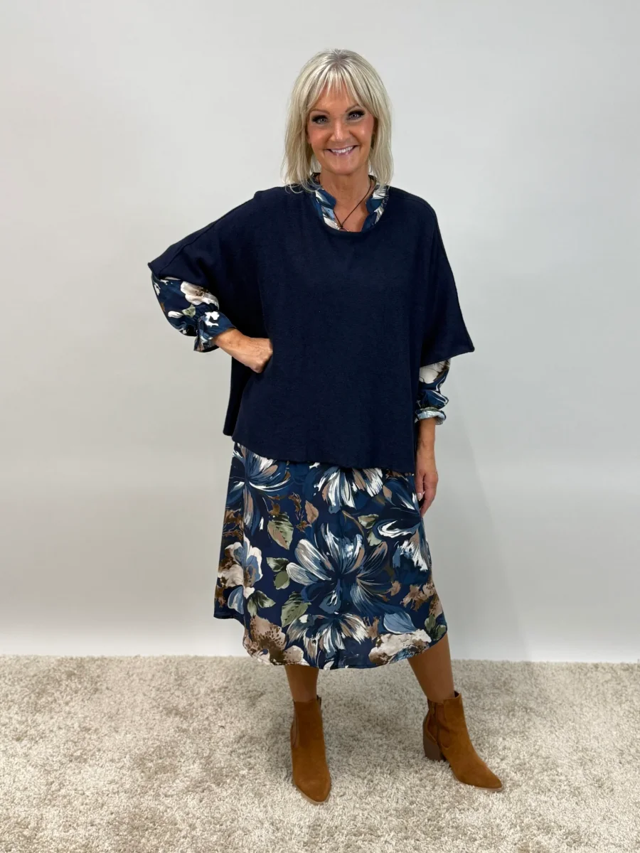 Storblommig klänning med motveck och volang på ärm.