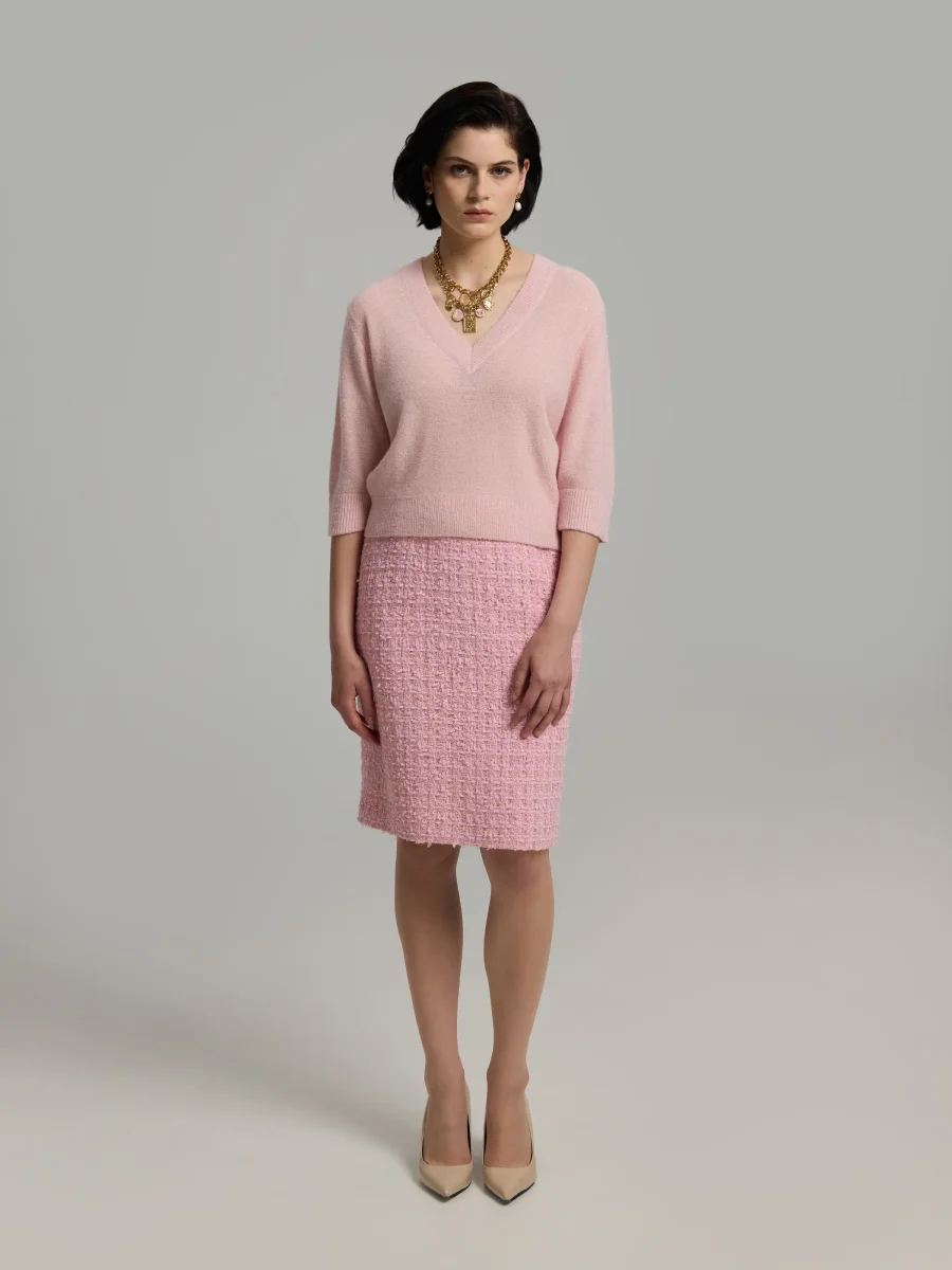 En rutig bouclé-kjol med en skräddarsydd passform. Normal midja, knälång, dold dragkedja och slits baktill. Kjolen är fodrad. Tillverkad av högkvalitativt tyg.