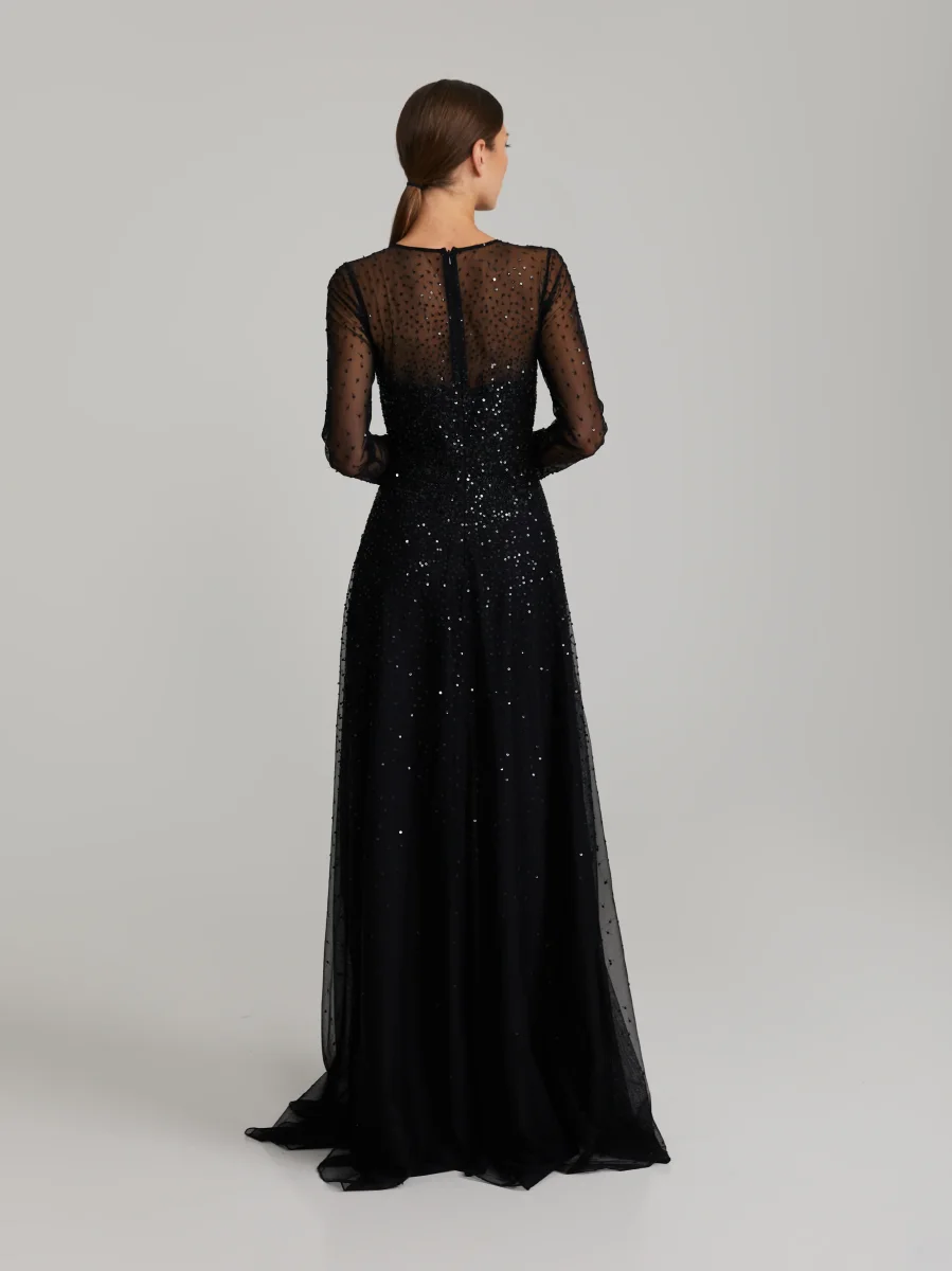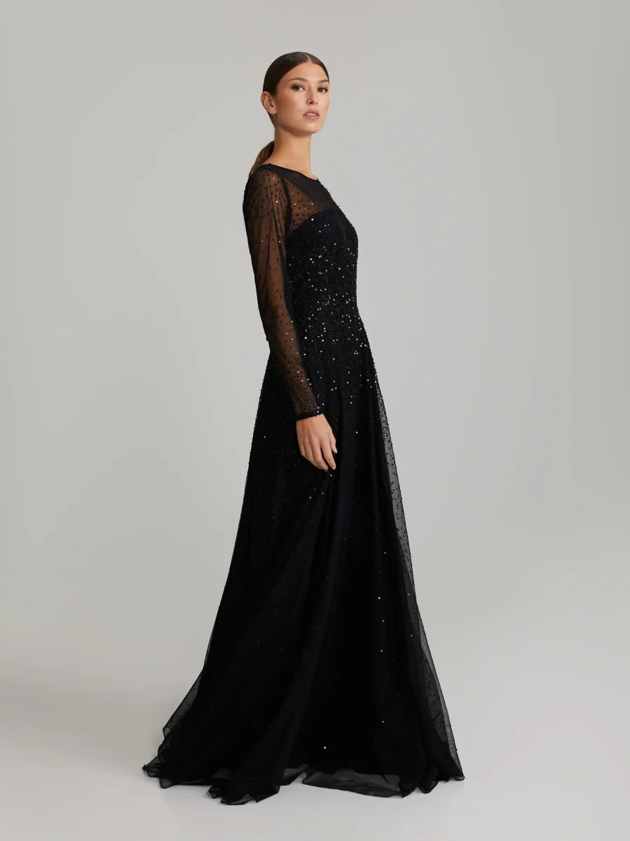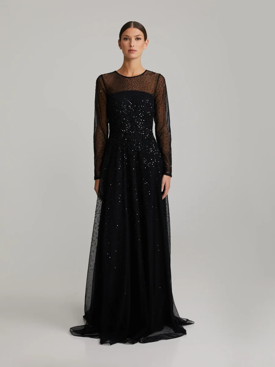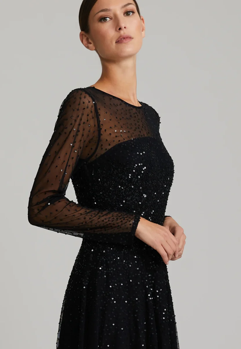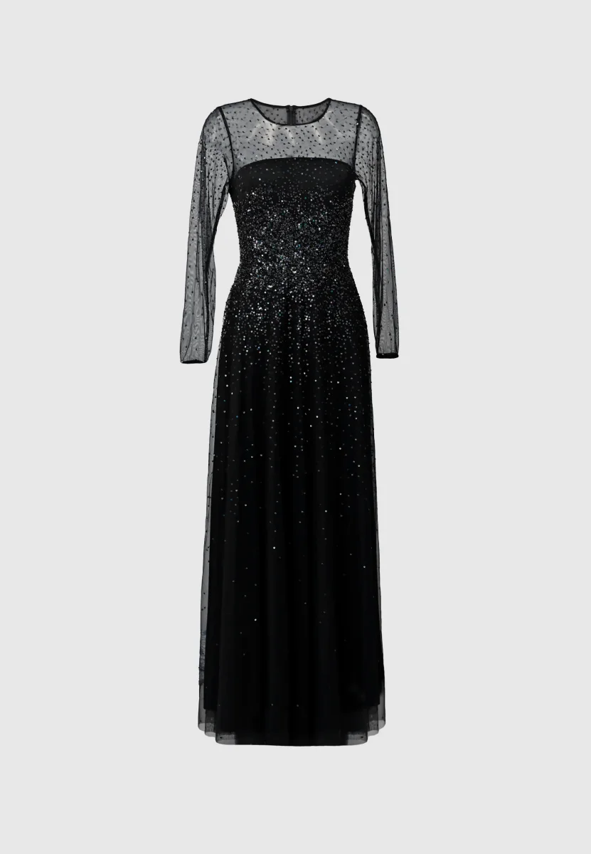 Maxiklänning med paljetter. Klänningen har långa ärmar och hög halsringning. Dold dragkedja och häftklammer bak. Klänningen är fodrad.